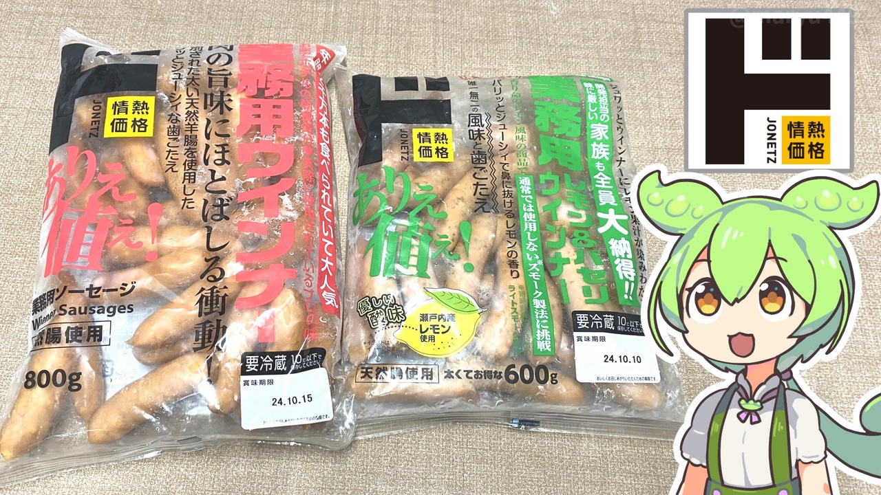 ドンキのたっぷり入った業務用ウインナーです。<br> 味はプレーンとレモン&パセリがありどちらも同じ値段ですが <br>レモパセのほうが量がやや少ないです。 <br>今まで紹介してきたトプバパン1280円にも動きがあったようなので <br>少し話題にあげていきます。 <br><br><br>前回のドン・キホーテ「有機むき栗(299円)」<br><a href="https://www.nicovideo.jp/watch/sm44194916" target="_blank" rel="noopener nofollow">https://www.nicovideo.jp/watch/sm44194916</a><br><br>【参考】 <br>業務用ウインナー 800g(ドン・キホーテ)<br> <a href="https://www.donki.com/j-kakaku/product/detail.php?item=3608" target="_blank" rel="noopener nofollow">https://www.donki.com/j-kakaku/product/detail.php?item=3608</a><br> 業務用レモン&パセリウインナー(ドン・キホーテ)<br> <a href="https://www.donki.com/j-kakaku/product/detail.php?item=4050" target="_blank" rel="noopener nofollow">https://www.donki.com/j-kakaku/product/detail.php?item=4050</a> <br>特級あらびきポークウインナー(トップバリュ) <br><a href="https://www.topvalu.net/items/detail/4549414448566/" target="_blank" rel="noopener nofollow">https://www.topvalu.net/items/detail/4549414448566/</a> <br>福留ハム<br><a href="https://www.fukutome.com/" target="_blank" rel="noopener nofollow">https://www.fukutome.com/</a> <br> お肉百科(伊藤ハム) <br><a href="https://www.itoham.co.jp/Portals/0/meat/00000005/#" target="_blank" rel="noopener nofollow">https://www.itoham.co.jp/Portals/0/meat/00000005/#</a> <br>【ガス火対応】HOME COORDY 軽くて持ちやすいフライパン26cm <br>グレージュ(イオンネットスーパー) <br><a href="https://shop.aeon.com/netsuper/01050000002350/010500000023504973996026063.html" target="_blank" rel="noopener nofollow">https://shop.aeon.com/netsuper/01050000002350/010500000023504973996026063.html</a><br> 広島県でレモンが有名なのはどうして?2021.12.28(徹底解剖!ひろしまラボ) <br><a href="https://www.pref.hiroshima.lg.jp/lab/topics/20211228/01/" target="_blank" rel="noopener nofollow">https://www.pref.hiroshima.lg.jp/lab/topics/20211228/01/</a> <br><br> 【使用した素材】(※敬称略) <br>(合成音声)VOICEVOX/ずんだもん/四国めたん/春日部つむぎ<br> <a href="https://voicevox.hiroshiba.jp/" target="_blank" rel="noopener nofollow">https://voicevox.hiroshiba.jp/</a> <br>(立ち絵)坂本アヒル <br><a href="https://seiga.nicovideo.jp/seiga/im10788496?track" target="_blank" rel="noopener nofollow">https://seiga.nicovideo.jp/seiga/im10788496?track</a> <br>(楽曲)甘茶の音楽工房/「楽しい麦畑」「フルーツパフェ」「お城の舞踏会」 <br><a href="https://amachamusic.chagasi.co" target="_blank" rel="noopener nofollow">https://amachamusic.chagasi.co</a>