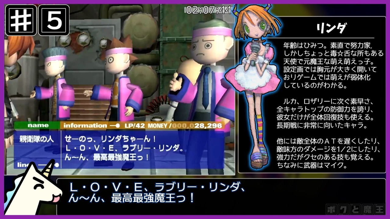 プレイステーション2『ボクと魔王』any%RTA、解説つき動画のパート5です。<br><br>キャプボが壊れたので、新しいのを買いました。<br>次のパートから別撮りシーンの画質が良くなる予定です。<br><br>part.4→<a href="https://www.nicovideo.jp/watch/sm44154623" class="watch">sm44154623</a><br>part.6→<a href="https://www.nicovideo.jp/watch/sm44301021" class="watch">sm44301021</a>。進捗はTwitter(現:X)@Nagisa381rtaで<br><br>走ったRTAのpart.1まとめ→<a href="https://www.nicovideo.jp/mylist/73222388" target="_blank" rel="noopener">mylist/73222388</a><br>RTA全部まとめ→<a href="https://www.nicovideo.jp/mylist/72786007" target="_blank" rel="noopener">mylist/72786007</a><br><br>無編集版→<a href="https://www.youtube.com/watch?v=-WYo3dm4daU&t=16550s" target="_blank" rel="noopener nofollow">https://www.youtube.com/watch?v=-WYo3dm4daU&t=16550s</a><br><br>▽レギュレーション<br>タイマー開始:タイトル画面で『NEW GAME』を選択した瞬間<br>タイマー終了:ラスボスを倒しアイテムが出現した瞬間<br><br>▽プレイ環境<br>PlayStation2 SCPH-50000実機<br>HDMI出力:Pound Tchnology HD Link Cable for PS2&PS1<br>キャプチャーボード:TreasLin HSV321<br>録画ソフト:OBS Studio<br><br>〇Twitter(現:X)→@Nagisa381rta<br><br>〇欲しいものリスト<br>→<a href="https://www.amazon.jp/hz/wishlist/ls/1S72L30BVRILK?ref_=wl_share" target="_blank" rel="noopener nofollow">https://www.amazon.jp/hz/wishlist/ls/1S72L30BVRILK?ref_=wl_share</a><br><br>〇今までの調査結果や攻略法をまとめた個人wikiを作りました<br>→<a href="https://w.atwiki.jp/nagisa381rta/" target="_blank" rel="noopener nofollow">https://w.atwiki.jp/nagisa381rta/</a><br><br><a target="_blank" href="https://qa.nicovideo.jp/faq/show/19424?site_domain=default" style="font-size: 13px;color: #657586; text-decoration: underline; line-height: 1.4">この動画は投稿者によって修正されました</a>