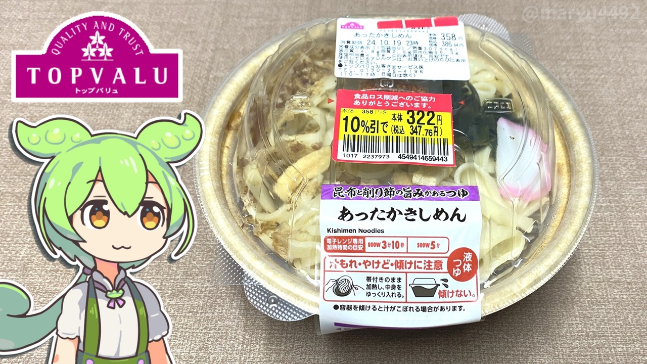最近、お昼も肌寒くなってきましたね。<br> お惣菜コーナーを見ていたら、温めるきしめんがあったので <br>食べてみたくなりました。<br><br><br><br>【関連動画】※全ての始まり<br>トップバリュの赤いヤツ「冷やしぶっかけ天ぷらうどん(30%引き)」<br><a href="https://www.nicovideo.jp/watch/sm42091854" target="_blank" rel="noopener nofollow">https://www.nicovideo.jp/watch/sm42091854</a><br><br>【参考】<br> あったかきしめん(イオン東北ネットスーパー)<br> <a href="https://ns.aeontohoku.net/netsuper/item/detail.aspx?tcd=71308&no=4901999101432" target="_blank" rel="noopener nofollow">https://ns.aeontohoku.net/netsuper/item/detail.aspx?tcd=71308&no=4901999101432</a> <br>大徳食品株式会社<br> <a href="http://www.daitoku-sh.co.jp/" target="_blank" rel="noopener nofollow">http://www.daitoku-sh.co.jp/</a><br><br>【使用した素材】(※敬称略) <br>(合成音声)VOICEVOX/ずんだもん/四国めたん<br> <a href="https://voicevox.hiroshiba.jp/" target="_blank" rel="noopener nofollow">https://voicevox.hiroshiba.jp/</a> <br>(立ち絵)坂本アヒル <br><a href="https://seiga.nicovideo.jp/seiga/im10788496?track" target="_blank" rel="noopener nofollow">https://seiga.nicovideo.jp/seiga/im10788496?track</a> <br>(楽曲)甘茶の音楽工房/「楽しい麦畑」「フルーツパフェ」「お城の舞踏会」 <br><a href="https://amachamusic.chagasi.co" target="_blank" rel="noopener nofollow">https://amachamusic.chagasi.co</a>