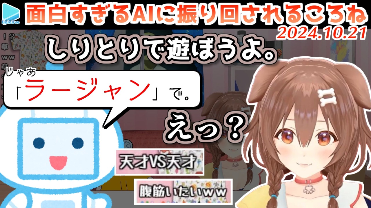 イケメンのくだりは爆笑しながら編集してました<br><br><a href="#" class="seekTime" data-seekTime="00:00" onclick="seekNicoPlayer('#00:00'); return false;">#00:00</a> はじめまして<br><a href="#" class="seekTime" data-seekTime="00:44" onclick="seekNicoPlayer('#00:44'); return false;">#00:44</a> ホロライブ知ってる?<br><a href="#" class="seekTime" data-seekTime="01:22" onclick="seekNicoPlayer('#01:22'); return false;">#01:22</a> ぺこ<br><a href="#" class="seekTime" data-seekTime="03:16" onclick="seekNicoPlayer('#03:16'); return false;">#03:16</a> モンハンとポケモン<br><a href="#" class="seekTime" data-seekTime="05:18" onclick="seekNicoPlayer('#05:18'); return false;">#05:18</a> 星街すいせい<br><a href="#" class="seekTime" data-seekTime="07:40" onclick="seekNicoPlayer('#07:40'); return false;">#07:40</a> しりとり<br><a href="#" class="seekTime" data-seekTime="10:36" onclick="seekNicoPlayer('#10:36'); return false;">#10:36</a> 歌<br><a href="#" class="seekTime" data-seekTime="13:33" onclick="seekNicoPlayer('#13:33'); return false;">#13:33</a> 好きな映画<br><a href="#" class="seekTime" data-seekTime="15:17" onclick="seekNicoPlayer('#15:17'); return false;">#15:17</a> イケメン<br><a href="#" class="seekTime" data-seekTime="18:26" onclick="seekNicoPlayer('#18:26'); return false;">#18:26</a> クイズ<br><br>元動画様はこちら<br>戌神ころね、おしゃべりAIのコトモちゃんと雑談コラボ!!!<br><a href="https://youtu.be/H_1-uFgQrrg" target="_blank" rel="noopener nofollow">https://youtu.be/H_1-uFgQrrg</a><br><br>Korone Ch. 戌神ころね <a href="https://t.co/qeTXwRU2F1" target="_blank" rel="noopener nofollow">https://t.co/qeTXwRU2F1</a><br /><span style="color: #b7b7b7; font-size: 10px;">ホロライブ切り抜き/なめたけ <a href="https://t.co/CBwJLnYR2c" target="_blank" rel="noopener nofollow">https://t.co/CBwJLnYR2c</a></span>