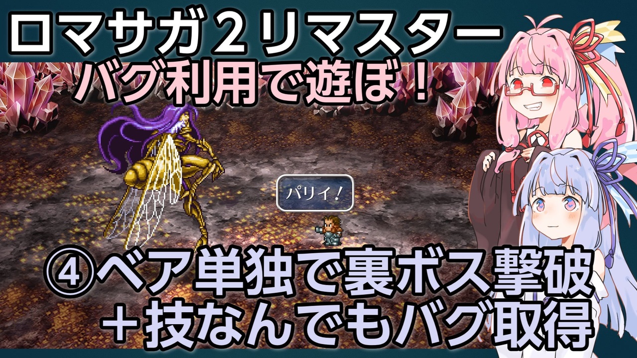 2日後(投稿時点)に迫ったロマンシング サガ2 リベンジオブザセブンの発売を応援するため、久しぶりに動画を作ってみました<br>4話+おまけで完結予定です<br>楽しんでもらえたらうれしいです!<br><br>シリーズの内容としては、まっとうな攻略ではなく、<br>・アイテム生成などのバグ技紹介<br>・リマスターの追加要素紹介<br>というもので構成されています<br><br>リベンジオブザセブンの発売前に実際にプレイしなおしたり、内容を思い返したりするときに、こちらの動画を利用してもらえたらとてもうれしいです<br><br>みんな、ロマサガ2Rの発売を楽しみましょうぜ!<br><br>第1話:<a href="https://www.nicovideo.jp/watch/sm44145269" class="watch">sm44145269</a><br>←前:<a href="https://www.nicovideo.jp/watch/sm44188360" class="watch">sm44188360</a><br>→次:<a href="https://www.nicovideo.jp/watch/sm44243606" class="watch">sm44243606</a><br><br>連絡先:<a href="https://x.com/HinatamaCH" target="_blank" rel="noopener nofollow">https://x.com/HinatamaCH</a><br>気軽にフォローしてもらえると、とてもうれしいです!<br><br>お世話になった作者様・作品たち<br>動画で紹介している技は私が発見したものではなく、偉大な先人たちが編み出していったものであります。<br>なので、この動画が面白かったら、以下の動画をぜひともご覧いただけるとうれしいです!<br>パルポロ様<br>(タップバグ)<a href="https://www.nicovideo.jp/watch/sm40417264" class="watch">sm40417264</a><br>(RTA)<a href="https://www.nicovideo.jp/watch/sm44014929" class="watch">sm44014929</a><br>おやつ様<br><a href="https://www.nicovideo.jp/watch/sm43903270" class="watch">sm43903270</a><br><a href="https://www.nicovideo.jp/watch/sm44147667" class="watch">sm44147667</a><br><a href="https://www.nicovideo.jp/watch/sm44195649" class="watch">sm44195649</a>(まさかの2度目のネタ被り!)<br>HAKUA(白鴉)様<br><a href="https://www.nicovideo.jp/watch/sm44021000" class="watch">sm44021000</a><br><br>素敵な立ち絵:のくな△様<br><a href="https://seiga.nicovideo.jp/user/illust/28390698" target="_blank" rel="noopener nofollow">https://seiga.nicovideo.jp/user/illust/28390698</a><br><br>みんな大好きカエル研究室様<br><a href="http://kaerulabo.web.fc2.com/rs2/index.htm" target="_blank" rel="noopener nofollow">http://kaerulabo.web.fc2.com/rs2/index.htm</a><br><br>追憶の迷宮などの攻略が満載のGCGX様<br><a href="https://gcgx.games/rs2/" target="_blank" rel="noopener nofollow">https://gcgx.games/rs2/</a><br><br><br>© 1993,2010,2016,2017 SQUARE ENIX CO., LTD. All Rights Reserved.<br>Planned & Developed by ArtePiazza<br>ILLUSTRATION:TOMOMI KOBAYASHI<br>CG Illustration : ArtePiazza<br>当該作品の転載・配布は禁止いたします。