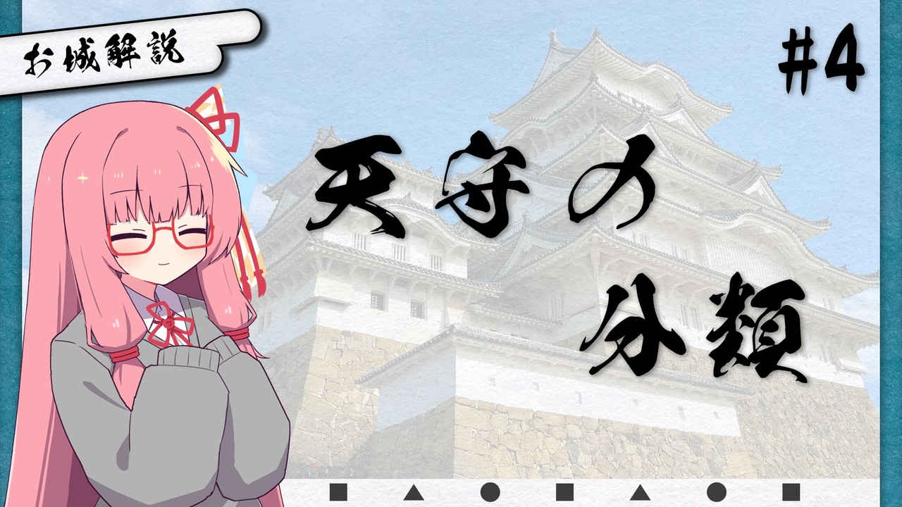 お城好きの茜ちゃんがお城の解説のような何かをしてくれる動画 ぱーとふぉお。<br>今回は天守の形、構成、史実の忠実性による分類わけについて。分類わけ要素多すぎん??<br><br>本シリーズは<br><strong>お城の事よく知らない方~初心者あたり</strong>に向けた内容のつもりです。<br>情報量で溺れさせないよう、全ては語りません。(お城有識者の補足コメントなど大歓迎です!)<br><br><strong>《視聴の際の注意》</strong><br><span style="color: #ff0000;">※中の人は専門家でも何でもないただのお城好き(城郭検定2級所持)です。参考程度でお願いします。</span><br> 間違えてたら優しく教えてください。<br>※諸説ある歴史は諸説楽しみましょう。<br><br><strong>《声・お借りした素材》</strong><br>声:A.I.VOICE2 琴葉茜 / 葵<br>立ち絵:ことのは(もえ) ゆめうつうつ 様 <a href="https://seiga.nicovideo.jp/seiga/im11419114" target="_blank" rel="noopener">im11419114</a><br>BGM:真夜中の一人お茶会 ユーキヒロセ 様 <a href="https://www.youtube.com/watch?v=Mo50ueX58HM&t=298s" target="_blank" rel="noopener nofollow">https://www.youtube.com/watch?v=Mo50ueX58HM&t=298s</a><br>効果音:効果音ラボ 様<br>フォント:玉ねぎ楷書製品版 <a href="https://gyokutendo.booth.pm/items/2111678" target="_blank" rel="noopener nofollow">https://gyokutendo.booth.pm/items/2111678</a><br><br><strong>《参考文献・サイト》</strong><br>・よくわかる日本の城 日本城郭検定公式参考書(著 加藤理文 様) (ONE PUBLISHING)<br>・天守の分類(現存天守、復元天守、復興天守、模擬天守の数)攻城団 様<br> (<a href="https://kojodan.jp/blog/entry/2019/02/25/191515)" target="_blank" rel="noopener nofollow">https://kojodan.jp/blog/entry/2019/02/25/191515)</a><br /><br><span style="color: #cc4125; font-size: 24px;"><strong>城郭登城祭第三陣やるよ~! みんなお城行こうね!</strong></span><br>詳しくは下記の告知動画を観てね!<br>◆開催期間:<br>2026年4月4日(土) 0:00 ~ 4月12日(日) 23:59<br><br>◆告知動画:<br><a href="https://www.nicovideo.jp/watch/sm45392440" class="watch">sm45392440</a><br><br>《城郭登城祭第二陣(2025)の参加動画》<br><a href="https://www.nicovideo.jp/mylist/77145802" target="_blank" rel="noopener">mylist/77145802</a><br><br>《琴葉姉妹のお城さんぽ》<br><a href="https://www.nicovideo.jp/series/332352" target="_blank" rel="noopener">series/332352</a><br><br>《お城の初心者解説動画のような何か》<br><a href="https://www.nicovideo.jp/series/485578" target="_blank" rel="noopener">series/485578</a><br><br>いつもコメントやいいね、広告等で応援いただきありがとうございます!物凄く励みになってます!<br>良ければ気軽にフォローとか反応頂けたら嬉しみです~( ˘ω˘)<br><br>中の人のあれこれ(lit link)→ <a href="https://lit.link/yunominochashibu" target="_blank" rel="noopener nofollow">https://lit.link/yunominochashibu</a><br><br><a target="_blank" href="https://qa.nicovideo.jp/faq/show/19424?site_domain=default" style="font-size: 13px;color: #657586; text-decoration: underline; line-height: 1.4">この動画は投稿者によって修正されました</a>