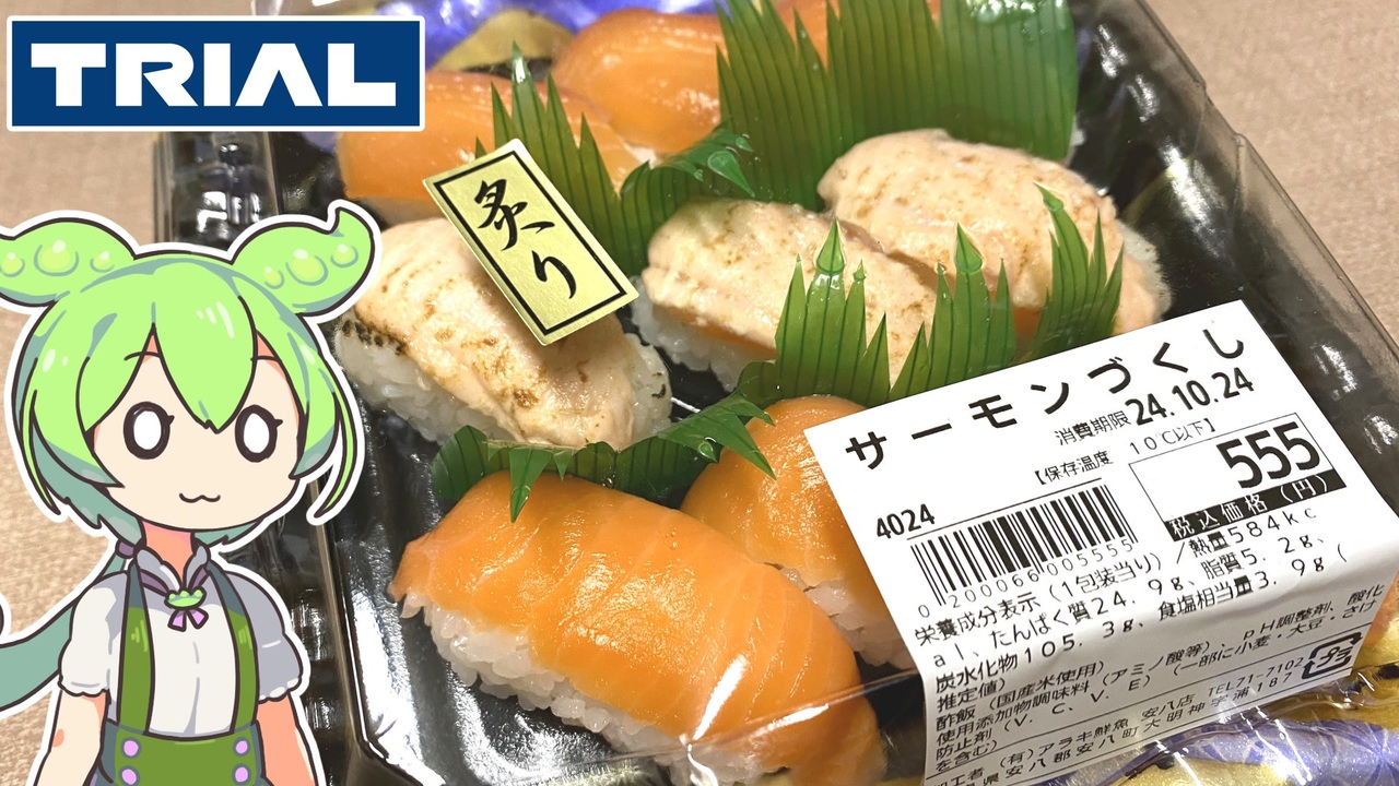 トライアルがポイントアップの感謝祭をしていたので <br>何か美味しそうなものがないか探してきました。 <br><br><br><br>【関連動画】<br> トライアルの「握り寿司(半額)」2024.06.18<br>※ニコニコ動画休止中の動画の為、YouTubeになります<br><a href="https://www.youtube.com/watch?v=d5aE0CA3kg4&t=14s" target="_blank" rel="noopener nofollow">https://www.youtube.com/watch?v=d5aE0CA3kg4&t=14s</a><br><br>【参考】<br> トライアルプリペイドカード(トライアル) <br><a href="https://www.trial-net.co.jp/prepaid/" target="_blank" rel="noopener nofollow">https://www.trial-net.co.jp/prepaid/</a> <br>レジ待ち時間が最短4分の1に!トライアルのレジカートの使い方(トライアル)<br> <a href="https://www.trial-net.co.jp/mag/detail/424/" target="_blank" rel="noopener nofollow">https://www.trial-net.co.jp/mag/detail/424/</a> <br>おろしわさび(トップバリュ)<br> <a href="https://www.topvalu.net/items/detail/4549741385213/" target="_blank" rel="noopener nofollow">https://www.topvalu.net/items/detail/4549741385213/</a> <br>のんある気分〈青りんごサワー ノンアルコール〉350ml缶(サントリー) <br><a href="https://products.suntory.co.jp/d/4901777413436/" target="_blank" rel="noopener nofollow">https://products.suntory.co.jp/d/4901777413436/</a><br><br> 【使用した素材】(※敬称略)<br> (合成音声)VOICEVOX/ずんだもん/四国めたん<br> <a href="https://voicevox.hiroshiba.jp/" target="_blank" rel="noopener nofollow">https://voicevox.hiroshiba.jp/</a> <br>(立ち絵)坂本アヒル<br> <a href="https://seiga.nicovideo.jp/seiga/im10788496?track" target="_blank" rel="noopener nofollow">https://seiga.nicovideo.jp/seiga/im10788496?track</a> <br>(楽曲)甘茶の音楽工房/「楽しい麦畑」「フルーツパフェ」「お城の舞踏会」 <br><a href="https://amachamusic.chagasi.co" target="_blank" rel="noopener nofollow">https://amachamusic.chagasi.co</a>