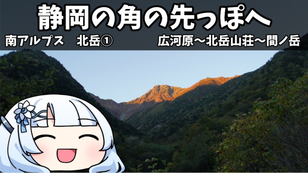 南アルプスの北岳、間ノ岳へ一泊二日で登ります<br>一日目は間ノ岳へ<br>静岡県の角の先端はその山頂なんです<br><br><br><br>北岳:<a href="https://minami-alpskankou.jp/?page_id=5513" target="_blank" rel="noopener nofollow">https://minami-alpskankou.jp/?page_id=5513</a><br><br>間ノ岳:<a href="https://www.yamakei-online.com/yamanavi/yama.php?yama_id=593" target="_blank" rel="noopener nofollow">https://www.yamakei-online.com/yamanavi/yama.php?yama_id=593</a><br><br>北岳山荘:<a href="https://minami-alpskankou.jp/?page_id=5611" target="_blank" rel="noopener nofollow">https://minami-alpskankou.jp/?page_id=5611</a><br><br><br>使用させていただいたもの<br><br>【音声】<br>VOICEBOX:WhiteCUL<br>2次利用ガイドライン<br><a href="https://commons.nicovideo.jp/works/agreement/nc312647" target="_blank" rel="noopener nofollow">https://commons.nicovideo.jp/works/agreement/nc312647</a><br><br>【立ち絵】<br>WhiteCUL<br><br>ヒザフライ様 ゆっくりWhiteCUL素材 <a href="https://seiga.nicovideo.jp/seiga/im11288356" target="_blank" rel="noopener nofollow">https://seiga.nicovideo.jp/seiga/im11288356</a><br><br>聡間まこと様 ver.1.0 立ち絵素材なWhiteCULさん。<a href="https://seiga.nicovideo.jp/seiga/im11414159" target="_blank" rel="noopener nofollow">https://seiga.nicovideo.jp/seiga/im11414159</a><br><br><br>【BGM】<br>DOVA-SYNDROME様 <a href="https://dova-s.jp/bgm/play2354.html" target="_blank" rel="noopener nofollow">https://dova-s.jp/bgm/play2354.html</a><br><br><br>【その他】<br>雫ちゃん様 【フルHD】アイシーカラーのスパイラルトランジション:<a href="https://commons.nicovideo.jp/works/nc363818" target="_blank" rel="noopener nofollow">https://commons.nicovideo.jp/works/nc363818</a><br><br><br>シャル様 シーンチェンジ青(下から斜めに迫ってくるトランジション:<a href="https://commons.nicovideo.jp/works/nc224466" target="_blank" rel="noopener nofollow">https://commons.nicovideo.jp/works/nc224466</a><br><br><br />カニを見に行ったり山に登ったり料理をしたり自転車やバイクに乗ったりします<br>私は雪さんの優しい声が好きなので、おとなしめな雪さんです<br><br><a target="_blank" href="https://qa.nicovideo.jp/faq/show/19424?site_domain=default" style="font-size: 13px;color: #657586; text-decoration: underline; line-height: 1.4">この動画は投稿者によって修正されました</a>