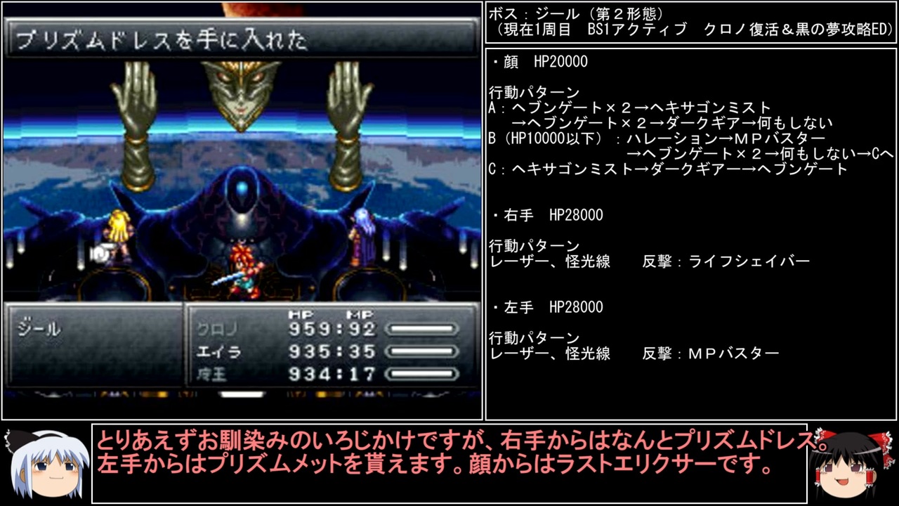 1周目の集大成です。飛ばした人は単発の豆知識動画だけでも見てね!<br><br>マニアしか知らない豆知識 ブラックホール編→<a href="https://www.nicovideo.jp/watch/sm44250362" class="watch">sm44250362</a><br>前→<a href="https://www.nicovideo.jp/watch/sm44237722" class="watch">sm44237722</a><br>次→<a href="https://www.nicovideo.jp/watch/sm44267623" class="watch">sm44267623</a><br><br>YouTube版→<a href="https://youtu.be/GaVu7aUy4gI" target="_blank" rel="noopener nofollow">https://youtu.be/GaVu7aUy4gI</a><br><br>縛りルール<br>①一度使った武器・防具・アクセサリー・道具・技・連携は<br> 次周回以降使用禁止(売却も解禁扱い)<br><br>②一度戦った敵シンボルとの再戦禁止。<br><br>③初戦闘の敵からの逃走禁止。<br><br>④裏技、バグ技、状況再現禁止。<br><br>⑤BS1アクティブからBS8ウェイトまで<br> 全てのバトルスピードとバトルモードで攻略する。<br><br>⑥各周回において見る予定のED条件を<br> 満たした段階で即ラヴォスと戦いに行く。<br><br>※ネタバレ注意です<br><br>このページ、動画で利用している弊社または弊社のライセンサーが権利を有する著作物の転載・配布は禁止いたします。<br>© 1995, 2018 SQUARE ENIX<br>Illustration: © 1995 BIRD STUDIO / SHUEISHA<br>Story and Screenplay: © 1995, 2008 ARMOR PROJECT / SQUARE ENIX<br><br>AquesTalk2ライセンスID:AQTK2WINUSR23122185<br /><br><br>❤いいねを押していただけるとモチベーションと投稿速度が上がるので宜しくお願い致します!<br><br>作者ツイッター→ <a href="https://twitter.com/nig0117" target="_blank" rel="noopener nofollow">https://twitter.com/nig0117</a><br>PIXIV FANBOX→ <a href="https://sutanokeiji.fanbox.cc/" target="_blank" rel="noopener nofollow">https://sutanokeiji.fanbox.cc/</a><br><br>( 以前はWEB小説書いてました→ <a href="https://kakuyomu.jp/works/1177354054884910267" target="_blank" rel="noopener nofollow">https://kakuyomu.jp/works/1177354054884910267</a> )