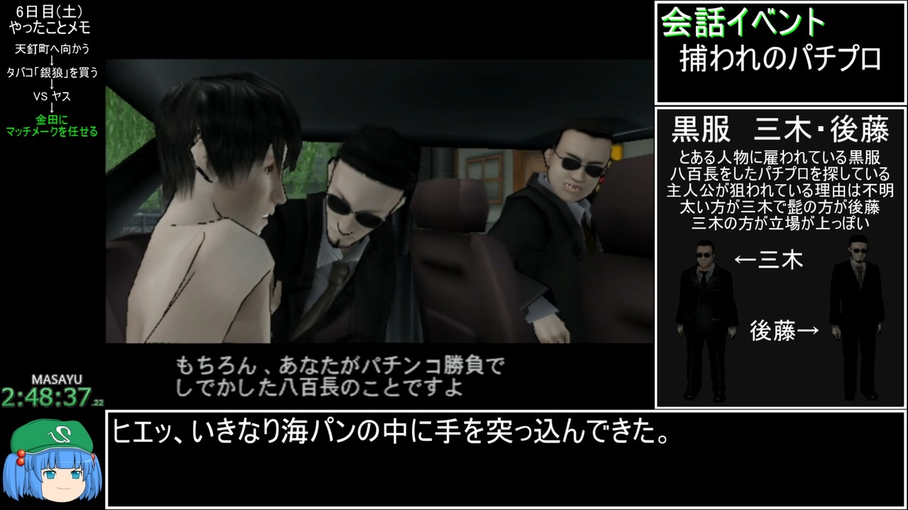 ハーッハッハッハッハッハッハッハ!<br>ホスト1日体験まで<br><br>前→<a href="https://www.nicovideo.jp/watch/sm44231455" class="watch">sm44231455</a><br>次→<a href="https://www.nicovideo.jp/watch/sm44280751" class="watch">sm44280751</a><br>投稿動画→<a href="https://www.nicovideo.jp/mylist/44129502" target="_blank" rel="noopener">mylist/44129502</a><br><br>無編集→<a href="https://www.youtube.com/watch?v=SwGUdKv4l_E" target="_blank" rel="noopener nofollow">https://www.youtube.com/watch?v=SwGUdKv4l_E</a><br><br>使用機種「PS2」<br>レギュレーション<br>・はじめからを押してから~エンディング後にFinと表示されるまで<br>・バグ不可(ないと思うけど)<br><br>X→<a href="https://x.com/masayu_345" target="_blank" rel="noopener nofollow">https://x.com/masayu_345</a>