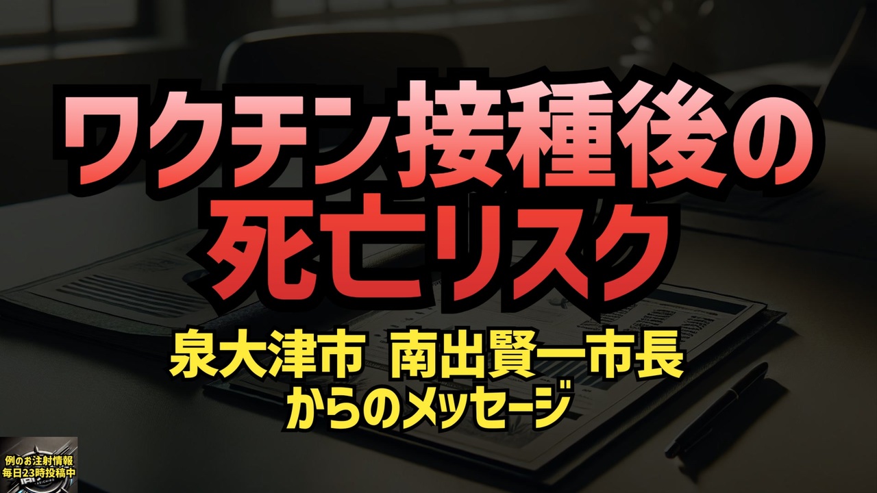 みのり先生<br>すごいデータが出た。国もこれくらいの調査をして国民にデータを公表すべきでしょう。南出賢一市長が総理大臣だったらいいのに。<br><a href="https://x.com/koumonka_doctor/status/1850458864753463482?t=cii1dXgA_EdMWccmD3G-vA&s=19" target="_blank" rel="noopener nofollow">https://x.com/koumonka_doctor/status/1850458864753463482?t=cii1dXgA_EdMWccmD3G-vA&s=19</a><br><br><br>福田先生<br>2024.10.18大阪府 泉大津市 南出賢一市長<br>泉大津市において、2022.1.4〜2024.3.6接種と死亡日を調べた。<br>打って5か月目をピークに死亡の山ができてた。<br>ワクチンの影響が無ければ、死亡の山はなく、平らなはずだ。<br>さらに頻回接種してる人の方が、死亡リスク高い<br><br>全国で検証やれ<br>youtu.be/TldtsD6n8n4<br><br><a href="https://x.com/fseiichizb4/status/1847296059753861214?t=N_mvLi9JIBcShjbaG9yZkg&s=19" target="_blank" rel="noopener nofollow">https://x.com/fseiichizb4/status/1847296059753861214?t=N_mvLi9JIBcShjbaG9yZkg&s=19</a><br><br><br>ワクチン接種<br>死亡リスク<br>南出賢一<br>ブースター接種<br>ワクチン死<br>データ解析<br>免疫力低下<br>ワクチン頻回接種<br>mRNAワクチン<br>ワクチン<br>コロナワクチン<br><br><br>「接種後の増加傾向」<br><br><br />著作権、肖像権に配慮して作成しております。<br><br>◆気になったニュースの台本!?<br>メモ代わりに作った台本をそのままあげてます<br><a href="https://keiichiro8140.hatenablog.com/." target="_blank" rel="noopener nofollow">https://keiichiro8140.hatenablog.com/.</a><br><br><br>ここからはシリーズ紹介<br><br><br>◆ ワクチン解毒・デトックス<br><a href="https://x.gd/fZweg" target="_blank" rel="noopener nofollow">https://x.gd/fZweg</a><br><br>◆ウイリアム・マキス博士のがん治療(イベルメクチン・フェンベンダゾール等)<br><a href="https://x.gd/AtFYS" target="_blank" rel="noopener nofollow">https://x.gd/AtFYS</a><br><br>◆予防接種健康被害救済制度<br><a href="https://x.gd/0xK9x" target="_blank" rel="noopener nofollow">https://x.gd/0xK9x</a><br><br>◆気になったニュース #1501~<br><br>◆ 【ショートver】気になったニュース<br><a href="https://x.gd/7MxXC" target="_blank" rel="noopener nofollow">https://x.gd/7MxXC</a><br><br>◆ 気になったニュース #1001~<br><a href="https://x.gd/Lp8gv" target="_blank" rel="noopener nofollow">https://x.gd/Lp8gv</a><br><br>◆ 気になったニュース #501~<br><a href="https://x.gd/EmbS4" target="_blank" rel="noopener nofollow">https://x.gd/EmbS4</a><br><br>◆ 気になったニュース #1~#500<br><a href="https://x.gd/uPhNb" target="_blank" rel="noopener nofollow">https://x.gd/uPhNb</a><br><br>◆ X(旧Twitter)・テレグラムで気になった情報<br><a href="https://x.gd/YG6FT" target="_blank" rel="noopener nofollow">https://x.gd/YG6FT</a><br><br>◆ 日比谷5万人パレードデ⚪生放送アーカイブ動画<br><a href="https://x.gd/3CHJv" target="_blank" rel="noopener nofollow">https://x.gd/3CHJv</a><br><br>◆日比谷5万人パレード⚪モのマイリスト作ってみました<br><a href="https://nico.ms/mylist/76828848?ref=sp_other" target="_blank" rel="noopener nofollow">https://nico.ms/mylist/76828848?ref=sp_other</a><br><br>◆3.30 令和の百姓⚪⚪<br><a href="https://www.nicovideo.jp/series/511791?ref=garage_share_other" target="_blank" rel="noopener nofollow">https://www.nicovideo.jp/series/511791?ref=garage_share_other</a><br><br>◆ 及川幸久さんの【XNEWS】シリーズ<br><a href="https://x.gd/3k78K" target="_blank" rel="noopener nofollow">https://x.gd/3k78K</a><br><br>◆これまでの動画<a href="https://x.gd/sPXoJ" target="_blank" rel="noopener nofollow">https://x.gd/sPXoJ</a><br><br>◆もしも(BAN)の時のためのマイリンク集<a href="https://lit.link/K-16_News44" target="_blank" rel="noopener nofollow">https://lit.link/K-16_News44</a><br><br>