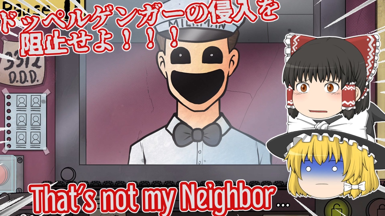 ゆっくり霊夢とゆっくり魔理沙が海外のホラーゲームに挑むようです。<br><br>本動画は東方Projectの二次創作です。 <br><br>◎あらすじ◎<br>主人公はとある建物の守衛の仕事をすることになった。<br>この世界は人間に擬態するドッペルゲンガーが数多くいる…<br>ドッペルゲンガーが人間のフリをして建物に侵入しないよう、<br>しっかり阻止していこう。<br><br>COEIROINK:ピエール・クラウン<br>COEIROINK:ネルカウニ<br>COEIROINK:アルマちゃん<br>COEIROINK:クロワちゃん<br><a href="https://coeiroink.com/" target="_blank" rel="noopener nofollow">https://coeiroink.com/</a><br><br>VOICEVOX:波音リツ<br>VOICEVOX:麒ヶ島宗麟<br><a href="https://voicevox.hiroshiba.jp/" target="_blank" rel="noopener nofollow">https://voicevox.hiroshiba.jp/</a><br><br>※投稿者のガバ翻訳付きです。<br>配信ページ 日本語非対応<br><a href="https://nachogames.itch.io/thats-not-my-neighbor" target="_blank" rel="noopener nofollow">https://nachogames.itch.io/thats-not-my-neighbor</a><br><br>BGMをお借りしました。<br><a href="https://otologic.jp/" target="_blank" rel="noopener nofollow">https://otologic.jp/</a><br><br>立ち絵をお借りしました。<br><a href="https://seiga.nicovideo.jp/seiga/im10933652" target="_blank" rel="noopener nofollow">https://seiga.nicovideo.jp/seiga/im10933652</a><br><a href="https://seiga.nicovideo.jp/seiga/im11230837" target="_blank" rel="noopener nofollow">https://seiga.nicovideo.jp/seiga/im11230837</a><br><a href="https://seiga.nicovideo.jp/seiga/im11229020" target="_blank" rel="noopener nofollow">https://seiga.nicovideo.jp/seiga/im11229020</a><br><a href="https://seiga.nicovideo.jp/seiga/im4817713" target="_blank" rel="noopener nofollow">https://seiga.nicovideo.jp/seiga/im4817713</a>