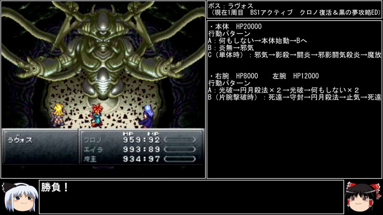 各周回の難易度とか、あまり考えていませんでしたが全18周を終えた後に振り返ろうと思います。<br>それほど大差はないように感じますけど、キツい周回は結構ギリです。<br>(※編集ミスでラヴォスコア戦にて、右枠のCの上にBをかぶせちゃいました。お許しを)<br><br>マニアしか知らない豆知識 動いてる物体に攻撃編→<a href="https://www.nicovideo.jp/watch/sm44267622" class="watch">sm44267622</a><br>前→<a href="https://www.nicovideo.jp/watch/sm44253526" class="watch">sm44253526</a><br>次→<a href="https://www.nicovideo.jp/watch/sm44303557" class="watch">sm44303557</a><br><br>YouTube版→<a href="https://youtu.be/Y5R_Ylt5qE0" target="_blank" rel="noopener nofollow">https://youtu.be/Y5R_Ylt5qE0</a><br><br>縛りルール<br>①一度使った武器・防具・アクセサリー・道具・技・連携は<br> 次周回以降使用禁止(売却も解禁扱い)<br><br>②一度戦った敵シンボルとの再戦禁止。<br><br>③初戦闘の敵からの逃走禁止。<br><br>④裏技、バグ技、状況再現禁止。<br><br>⑤BS1アクティブからBS8ウェイトまで<br> 全てのバトルスピードとバトルモードで攻略する。<br><br>⑥各周回において見る予定のED条件を<br> 満たした段階で即ラヴォスと戦いに行く。<br><br>※ネタバレ注意です<br><br>このページ、動画で利用している弊社または弊社のライセンサーが権利を有する著作物の転載・配布は禁止いたします。<br>© 1995, 2018 SQUARE ENIX<br>Illustration: © 1995 BIRD STUDIO / SHUEISHA<br>Story and Screenplay: © 1995, 2008 ARMOR PROJECT / SQUARE ENIX<br><br>AquesTalk2ライセンスID:AQTK2WINUSR23122185<br /><br><br>❤いいねを押していただけるとモチベーションと投稿速度が上がるので宜しくお願い致します!<br><br>作者ツイッター→ <a href="https://twitter.com/nig0117" target="_blank" rel="noopener nofollow">https://twitter.com/nig0117</a><br>PIXIV FANBOX→ <a href="https://sutanokeiji.fanbox.cc/" target="_blank" rel="noopener nofollow">https://sutanokeiji.fanbox.cc/</a><br><br>( 以前はWEB小説書いてました→ <a href="https://kakuyomu.jp/works/1177354054884910267" target="_blank" rel="noopener nofollow">https://kakuyomu.jp/works/1177354054884910267</a> )