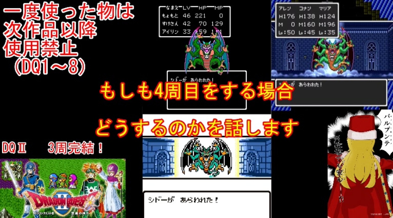 もしも他作品を考慮せずDQⅡ単独で何周できるかを聞かれたら<br><br>①ちからのたて<br>②パルプンテ<br>③ホイミ<br>④ザオリク<br>⑤ベホイミ<br>⑥ベホマ<br><br>といった感じで理論上は6周。 裏技ありならFC版は重複装備やはかぶさのけんがあれば回復なしでも攻略可能なので、もう少し増えると思……っていたんですが、トラマナがないとバリアーで死ぬので+1周が限界。<br>現実的にベホイミだけの5周目&ベホマだけの6周目が攻略可能かは防具次第?<br>DQⅡの周回解禁縛り、皆挑戦してみてね!<br><br>前→<a href="https://www.nicovideo.jp/watch/sm44267732" class="watch">sm44267732</a><br>次→<a href="https://www.nicovideo.jp/watch/sm44322714" class="watch">sm44322714</a><br><br>YouTube版→<a href="https://youtu.be/5di5g5HarR0" target="_blank" rel="noopener nofollow">https://youtu.be/5di5g5HarR0</a><br><br>縛りルール(詳細はpart1参照)<br>①一度使った武器・防具・装飾品・道具・呪文・特技は<br> 次作品以降使用禁止。(売却も解禁扱い)<br><br> 一度使った職業(3,6,7)・仲間モンスター(5,6)・スカウトモンスター(8)は<br> 戦士(Ⅲ)、戦士(Ⅵ)のようにナンバリングで分類し次作品以降使用禁止。<br> また複数体加入できる仲間モンスターは一体まで。<br><br>②裏技、バグ技、全滅、逃走、おどかす禁止。<br> またダンジョン攻略とボス戦における状況再現禁止。<br><br>③ダンジョンとボス攻略は、全キャラのレベルを突入時、<br> 1周目は目標レベル+5。2周目は+10。3周目は+15まで。<br> ラスボスの目標レベルは45。裏ボスは50とする。<br>(目標レベルは各公式ガイドブックを参照)<br><br>④1周目はEDまで。2周目は裏ボス撃破まで。<br> 3周目は全てのボスを規定回数、規定ターン以内に倒す。<br>(回避可能なボスも倒し、闇ゾーマは3周全てで倒す)<br><br><br><span style="color: #262626;">※一部機種は互換機を使用してのプレイとなりますが、倍速機能やクイックセーブ・ロード、チートなどは一切使用しません。</span><br><br>※ネタバレ注意です<br><br>この動画で利用している株式会社スクウェア・エニックスを代表とする共同著作者が権利を所有する著作物及びスギヤマ工房有限会社が権利を所有する楽曲の転載・配布は禁止いたします。<br>(C) ARMOR PROJECT/BIRD STUDIO/SQUARE ENIX All Rights Reserved.<br>(C) SUGIYAMA KOBO (P) SUGIYAMA KOBO<br><br>AquesTalk2ライセンスID:AQTK2WINUSR23122185<br /><br><br>❤いいねを押していただけるとモチベーションと投稿速度が上がるので宜しくお願い致します!<br><br>作者ツイッター→ <a href="https://twitter.com/nig0117" target="_blank" rel="noopener nofollow">https://twitter.com/nig0117</a><br>PIXIV FANBOX→ <a href="https://sutanokeiji.fanbox.cc/" target="_blank" rel="noopener nofollow">https://sutanokeiji.fanbox.cc/</a><br><br>( 以前はWEB小説書いてました→ <a href="https://kakuyomu.jp/works/1177354054884910267" target="_blank" rel="noopener nofollow">https://kakuyomu.jp/works/1177354054884910267</a> )