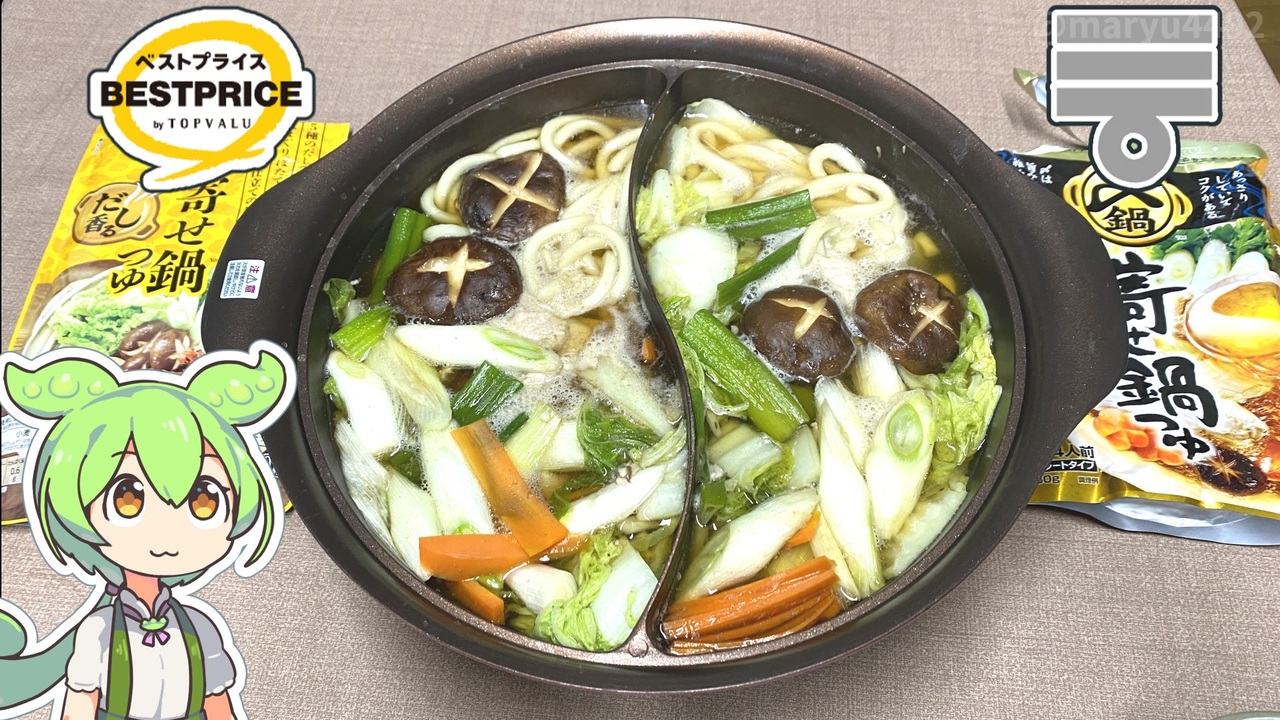 最近、肌寒い日が増えてきましたね。<br> そろそろ鍋をしてもいいかなと思い、今日は大胆に <br>トプバとミツカンの寄せ鍋の素を食べ比べてみようと思います。<br><br><br><br>【関連動画】 <br>ラ・ムーの「もやし鍋のつゆ」と「売り切れ御免 カナダ産 三元豚小間切れ(メガ)」<br><a href="https://www.nicovideo.jp/watch/sm43327661" target="_blank" rel="noopener nofollow">https://www.nicovideo.jp/watch/sm43327661</a><br><br> 【参考】 <br>だし香る寄せ鍋つゆ(トップバリュ) <br><a href="https://www.topvalu.net/items/detail/4549414629347/" target="_blank" rel="noopener nofollow">https://www.topvalu.net/items/detail/4549414629347/</a> <br>〆まで美味しい 寄せ鍋つゆ ストレート(トップバリュ)<br> <a href="https://www.mizkan.co.jp/product/group/?gid=07100" target="_blank" rel="noopener nofollow">https://www.mizkan.co.jp/product/group/?gid=07100</a><br> HOME COORDY 多機能2色鍋(トップバリュ)<br> <a href="https://www.topvalu.net/items/detail/4549414467659/" target="_blank" rel="noopener nofollow">https://www.topvalu.net/items/detail/4549414467659/</a> <br>フッ素樹脂加工フライパンの使い方とお手入れ(ベターホーム) <br><a href="https://net-shop.betterhome.jp/contents/1836/" target="_blank" rel="noopener nofollow">https://net-shop.betterhome.jp/contents/1836/</a> <br>表面加工フライパンの使い方(株式会社コーベック)<br> <a href="https://www.kohbec.jp/usemethods/1" target="_blank" rel="noopener nofollow">https://www.kohbec.jp/usemethods/1</a><br> ロゴマークへの思い(株式会社ダイショー)<br> <a href="https://www.daisho.co.jp/company/message" target="_blank" rel="noopener nofollow">https://www.daisho.co.jp/company/message</a><br><br> 【使用した素材】(※敬称略) <br>(合成音声)VOICEVOX/ずんだもん/四国めたん <br><a href="https://voicevox.hiroshiba.jp/" target="_blank" rel="noopener nofollow">https://voicevox.hiroshiba.jp/</a> <br>(立ち絵)坂本アヒル <br><a href="https://seiga.nicovideo.jp/seiga/im10788496?track" target="_blank" rel="noopener nofollow">https://seiga.nicovideo.jp/seiga/im10788496?track</a> <br>(地図)Map-It マップイット | 地図素材サイト <br><a href="https://map-it.azurewebsites.net/" target="_blank" rel="noopener nofollow">https://map-it.azurewebsites.net/</a> <br>(楽曲)甘茶の音楽工房/「楽しい麦畑」「フルーツパフェ」「お城の舞踏会」 <br><a href="https://amachamusic.chagasi.co" target="_blank" rel="noopener nofollow">https://amachamusic.chagasi.co</a>