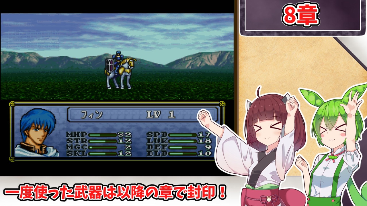 <span style="color: #85200c; font-size: 24px;"><strong><i>今回の動画は短め!(当社比)</i></strong></span><br><br><br><span style="font-size: 16px;"><strong>1:一度使用した武器種は、以降の章で使用する事を禁止する。<br>2:武器の使用の定義は『その武器を装備した状態で敵との戦闘が発生したタイミング』<br>または『その武器を使って敵に「捕える」コマンドを実行したタイミング』<br>杖の場合は『対象に対して使用した時点(命中の可否は問わない)』とする。 </strong></span><br><span style="color: #ff0000; font-size: 16px;"><strong>※同盟軍、演出による戦闘イベントでは使用した判定にはならないこととする。</strong></span><span style="font-size: 16px;"><strong> <br>3:仲間を47人生存させ、【外伝】を含む全ての章を攻略し、総合評価でB以上の状態でゲームをクリアする。</strong></span><br><br><br>本動画のシリーズリスト【<a href="https://www.nicovideo.jp/series/482976" target="_blank" rel="noopener">series/482976</a>】<br>『烈火』の同縛りプレイ【<a href="https://www.nicovideo.jp/series/406473" target="_blank" rel="noopener">series/406473</a>】<br>『封印』の同縛りプレイ【<a href="https://www.nicovideo.jp/series/316824" target="_blank" rel="noopener">series/316824</a>】<br>前:【<a href="https://www.nicovideo.jp/watch/sm44253129" class="watch">sm44253129</a>】次:【<a href="https://www.nicovideo.jp/watch/sm44307663" class="watch">sm44307663</a>】<br><br><strong>使用したソフト</strong><br>VOICEROID+東北きりたんEX<br>VOICEVOX:ずんだもん<br>VOICEPEAK ずんだもん<br><strong>お借りした素材</strong><br>ニコニコモンズの皆様(コンテンツツリー参照)