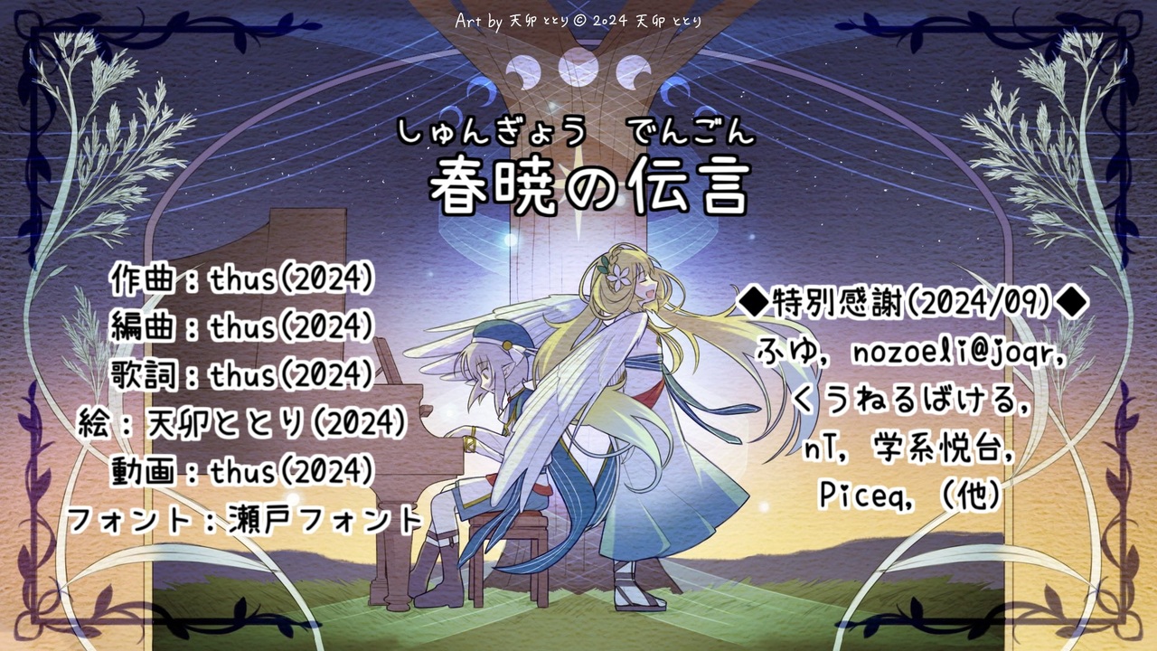 Art by 天卯ととり © 2024 天卯ととり<br>(Links:<a href="https://lit.link/nohakoniwa" target="_blank" rel="noopener nofollow">https://lit.link/nohakoniwa</a> )<br>―<br>◆「変拍子楽曲投稿祭」出展作品です。<br>(詳細:<a href="https://twipla.jp/events/607395" target="_blank" rel="noopener nofollow">https://twipla.jp/events/607395</a> )<br>・変拍子楽曲投稿祭公式:<a href="https://x.com/ITime_VocaloFes" target="_blank" rel="noopener nofollow">https://x.com/ITime_VocaloFes</a><br>・運営代表:凵[ウケバコ](<a href="https://www.nicovideo.jp/user/125087413" target="_blank" rel="noopener">user/125087413</a>)<br>―――<br><br> どうも、青白く光るthusです。カラオケ動画:<a href="https://www.nicovideo.jp/watch/sm44280075" class="watch">sm44280075</a><br> いまだけダブチ食べ美さんがドナルド・マクドナルドの子ども説がそこらじゅうで聞かれるようになりました。そうなると本名はいまだけダブチ食べ美・マクドナルドなのではという話も聞かれるようになりました。真鍋梅久 並の超絶怒涛に限定的なネーミング、故にいまだけダブチ食べ美さんはもう直ぐ公式から消滅する可能性が濃厚です。1年後にまた現れるかもしれませんが…。<br> そんなことよりDaisuke。最近の日清のcmが変なことになっ…否 前からだったかもしれませんが、愈々隠さなくなってきた気がします(あぁ~! ニコニコの音ォ〜!)。そんな調子で大丈夫かと思ったら、一番良い特上カップヌードルを紹介するほどに肝が据わっています。あいつは話を聞かないからなァ。<br> でも熟考してみると、何も日清さんだけではないかもしれません。ラーメン屋を始めた戸愚呂(弟)さんが幽助さんをZUBAAAN!とぶっ倒したり、舞台版ボーボボが文化庁から補助金を受けていることから日本政府の中枢にハジケリストが侵入していることが分かったりと、様々な処に某勢力が確実に存在しているのです。これこそが平和ですね。<br> あわよくば私もその一員でありたいと思ったり思わなかったり。だから段ボール箱でテトリスをしようとしたところ、崩れ落ちて中のチョコレートが雪崩れました。これが仮面ライダーガヴですね。その中に海老が紛れ込んでいたので搓んでおきましょう。<br><br> …と思っていたのかァ? その気になっていたお前の姿はお笑いだったぜェ(※なんてことを言っているので、この後ポットに入れられて潰されます)<br><br> POISON。<br /><br><br><br>====================<br>| 2026/01/04 21:00「インスペクタの自死未遂」:<a href="https://www.nicovideo.jp/watch/sm45800854" class="watch">sm45800854</a><br>| 投稿曲マイリスト:<a href="https://www.nicovideo.jp/mylist/57867175" target="_blank" rel="noopener">mylist/57867175</a><br>|――――――――――――――――――<br>| pixivFANBOX:<a href="https://thus.fanbox.cc/" target="_blank" rel="noopener nofollow">https://thus.fanbox.cc/</a><br>| アルバム等配信中:<a href="https://thus-library.blogspot.com/search/label/discography" target="_blank" rel="noopener nofollow">https://thus-library.blogspot.com/search/label/discography</a><br>| つなぐ(依頼・リクエスト):<a href="https://tsunagu.cloud/users/thus" target="_blank" rel="noopener nofollow">https://tsunagu.cloud/users/thus</a><br>|――――――――――――――――――<br>| YouTube:<a href="https://youtube.com/@thus" target="_blank" rel="noopener nofollow">https://youtube.com/@thus</a><br>| X:<a href="https://x.com/thus_submission" target="_blank" rel="noopener nofollow">https://x.com/thus_submission</a><br>| 他全リンク:<a href="https://lit.link/thus" target="_blank" rel="noopener nofollow">https://lit.link/thus</a><br>|――――――――――――――――――<br>| オフボーカル等:<a href="https://piapro.jp/thus_999discommunication" target="_blank" rel="noopener nofollow">https://piapro.jp/thus_999discommunication</a><br>| 楽曲/動画の二次利用に関して:<a href="https://bit.ly/3JRQQiZ" target="_blank" rel="noopener nofollow">https://bit.ly/3JRQQiZ</a><br><span style="color: #262626;">| </span><span style="color: #262626;"><strong>歌詞図書館(ふりがな有るよ!):</strong></span><a href="https://thus-library.blogspot.com/" target="_blank" rel="noopener nofollow">https://thus-library.blogspot.com/</a><br>====================