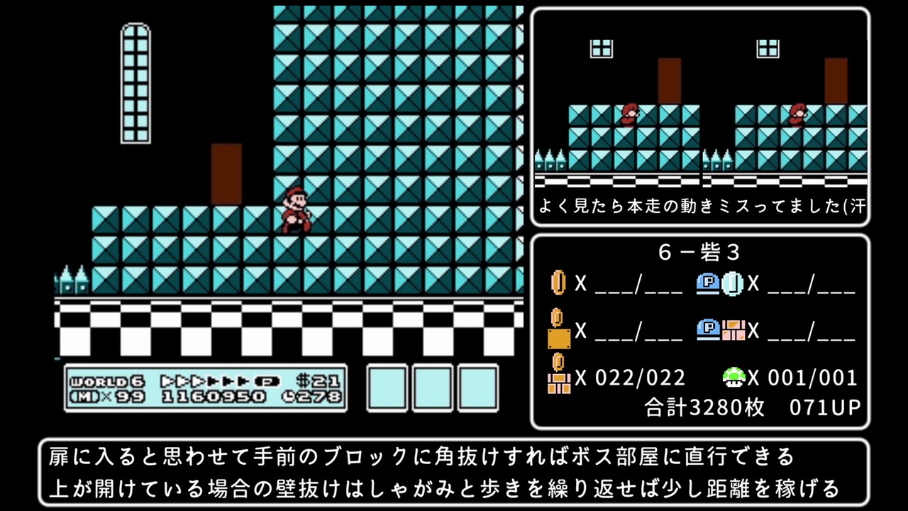 はじめまして!<br><br><br>とりあえず上に飛べば何かある ワールド6 氷の国となります。<br><br>6Wといえばやはり圧倒的なステージ数。<br>その物量にいやらしい配置のコイン、凍ったコインとかいう最適化の難しい新ギミックが加わり、<br>かなりの難易度に仕上がっています。<br>7Wはやばい砦がやばそうなので、1か月後くらいになると思います。<br><br><br>ブロックタイプ変数持ち越し参考リンク<br><a href="https://tasvideos.org/GameResources/NES/SuperMarioBros3" target="_blank" rel="noopener nofollow">https://tasvideos.org/GameResources/NES/SuperMarioBros3</a><br><a href="https://www.youtube.com/watch?v=TL0z64InnNk" target="_blank" rel="noopener nofollow">https://www.youtube.com/watch?v=TL0z64InnNk</a><br><br><br>~ルール~<br>①全ステージクリア&全ハンマーブロス撃破<br>②ノーミスクリア<br>③各ステージのコインと1UPをできる限り回収<br>④ただし以下の方法で得たコインは除外(退屈なループ防止&コイン枚数を調整するため)<br>・ゴール時に敵をコインに変える<br>・画面切替で一度取ったコインやPスイッチを復活させる<br>⑤ポーズ、メモリ破壊バグ禁止<br><br><br>追記回数:201,057回 (W6まで)<br>前回記録:なし<br><br><br>W1→<a href="https://www.nicovideo.jp/watch/sm44001497" class="watch">sm44001497</a> W5→<a href="https://www.nicovideo.jp/watch/sm44206296" class="watch">sm44206296</a> W7→<a href="https://www.nicovideo.jp/watch/sm44423971" class="watch">sm44423971</a>