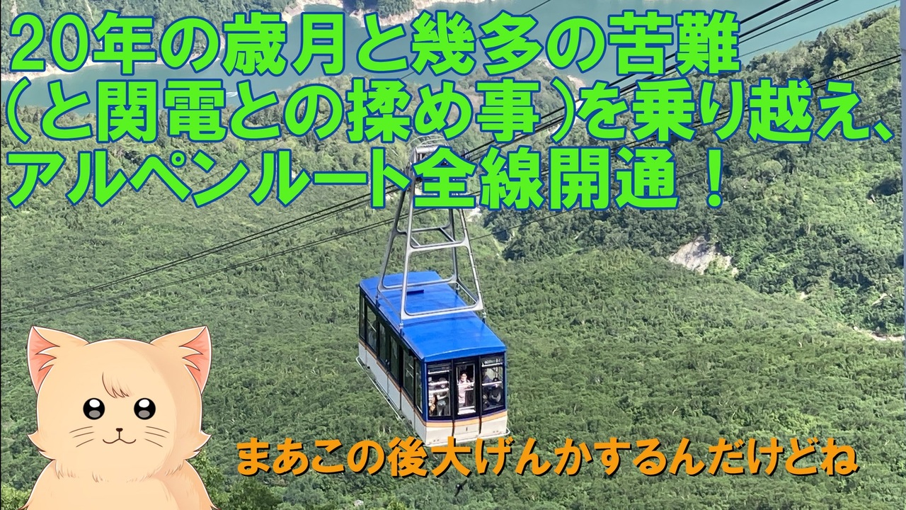 皆様大変お待たせしました。第三話でようやくアルペンルートが完成します。 <br><br>・・・まあ、このシリーズ的にはこの後の泥沼訴訟バトルが本番なんですけどね。<br><br><br>室堂までの道路建設の後は、黒部ダムまでどうやって繋げるか。当初富山県や佐伯宗義が考えていたのは産業道路計画で、立山を貫いて東京への最短ルートを結ぼうという壮大な野望でした。が、その計画は関電トンネルに一般車を通したくない関電の猛反対などで頓挫。現在のようなロープウェイやケーブルカーなどを乗り継ぐ方式に落ち着きます。 その後も建設主体や黒部湖駅の位置などを巡り、富山県側と関電側は揉めますが、難工事の末、ようやく長年の夢だったアルペンルートが全線開通します。 <br><br>・・・しかしその裏で、富山県サイドの不満は静かに蓄積されていくのでした。<br><br>第2話→<a href="https://www.nicovideo.jp/watch/sm44004454" class="watch">sm44004454</a> 第4話→<a href="https://www.nicovideo.jp/watch/sm44655818" class="watch">sm44655818</a><br /><span style="color: #000000; font-size: 14px;">迷航空会社列伝</span><span style="color: #006699; font-size: 14px;"><a href="https://www.nicovideo.jp/mylist/24098760" target="_blank" rel="noopener">mylist/24098760</a></span><span style="color: #000000; font-size: 14px;"> 迷列車北陸編</span><span style="color: #006699; font-size: 14px;"><a href="https://www.nicovideo.jp/mylist/19084652" target="_blank" rel="noopener">mylist/19084652</a> </span><span style="color: #000000; font-size: 14px;">東海道交通戦争</span><span style="color: #006699; font-size: 14px;"><a href="https://www.nicovideo.jp/mylist/57958388" target="_blank" rel="noopener">mylist/57958388</a></span><span style="color: #000000; font-size: 14px;"> 交通機関の栄枯盛衰 </span><a href="https://www.nicovideo.jp/mylist/66898301" target="_blank" rel="noopener">mylist/66898301</a><br><span style="color: #000000; font-size: 14px;">ブログ→</span><span style="color: #006699; font-size: 14px;"><a href="http://www.meihokuriku-alps.com" target="_blank" rel="noopener nofollow">http://www.meihokuriku-alps.com</a></span><br>note→<a href="https://note.com/meihokuriku" target="_blank" rel="noopener nofollow">https://note.com/meihokuriku</a><br><span style="color: #000000; font-size: 14px;">使用BGM<br>甘茶の音楽工房様 </span><span style="color: #006699; font-size: 14px;"><a href="http://amachamusic.chagasi.com/index.html" target="_blank" rel="noopener nofollow">http://amachamusic.chagasi.com/index.html</a></span><br><span style="color: #000000; font-size: 14px;">魔王魂様 </span><span style="color: #006699; font-size: 14px;"><a href="https://maoudamashii.jokersounds.com/list/bgm5.html" target="_blank" rel="noopener nofollow">https://maoudamashii.jokersounds.com/list/bgm5.html</a></span>