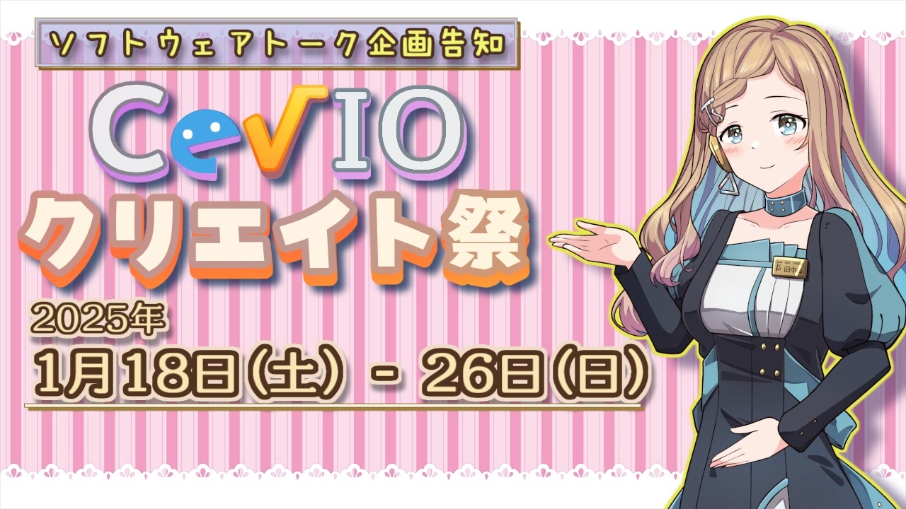 毎年1月、CeVIOの創作してみませんか?<br><br>[レギュレーション]<br>・CeVIO, VoiSonaの合成音声ソフト・ボイス素材、またはそれらのキャラクターを<br> 題材とした作品(動画、静画、小説)<br>・テーマは自由 (ただし、CeVIOやVoiSona各キャラクターの公式規約に従ったもの)<br>・オリジナルのキャラクターにCeVIO, VoiSonaの合成音声ソフトを使用した場合も参加可能<br>・第4回CeVIOクリエイト祭 のタグを付ける(ロックが可能な投稿サイトはロックしてください)<br> Xは、#第4回CeVIOクリエイト祭 のハッシュタグを付けます。<br><u>・(2024/12/21追加) 賞がある投稿祭との同時参加は、公平性を保つために不可とさせていただきます。</u><br>ご了承ください。賞がなければ、CeVIOクリエイト祭側としては同時参加可能です。<br><br>[開催期間] 2025/1/18(土) - 1/26(日)<br><br>[主催 兼 問い合わせ先] テステス<br><a href="https://x.com/tsts4767" target="_blank" rel="noopener nofollow">https://x.com/tsts4767</a><br><br>・イベントの運営・告知X <a href="https://x.com/CeVIO_CreateFes" target="_blank" rel="noopener nofollow">https://x.com/CeVIO_CreateFes</a><br>・第4回CeVIOクリエイト祭 <a href="https://www.nicovideo.jp/mylist/77268949" target="_blank" rel="noopener">mylist/77268949</a><br>・第4回CeVIOクリエイト前夜/後夜祭 <a href="https://www.nicovideo.jp/mylist/77269253" target="_blank" rel="noopener">mylist/77269253</a><br>・イラストクリップ <a href="https://seiga.nicovideo.jp/clip/3442112" target="_blank" rel="noopener">clip/3442112</a><br>・Pixiv <a href="https://www.pixiv.net/users/25805567/bookmarks/artworks/%E7%AC%AC4%E5%9B%9ECeVIO%E3%82%AF%E3%83%AA%E3%82%A8%E3%82%A4%E3%83%88%E7%A5%AD" target="_blank" rel="noopener nofollow">https://www.pixiv.net/users/25805567/bookmarks/artworks/%E7%AC%AC4%E5%9B%9ECeVIO%E3%82%AF%E3%83%AA%E3%82%A8%E3%82%A4%E3%83%88%E7%A5%AD</a><br>・Togetter: <a href="https://togetter.com/li/2464049" target="_blank" rel="noopener nofollow">https://togetter.com/li/2464049</a><br>・ロゴ<br><a href="https://drive.google.com/drive/folders/1MDsKEFL-rLvBtcuabWUGzUyek-SbwTWK?usp=sharing" target="_blank" rel="noopener nofollow">https://drive.google.com/drive/folders/1MDsKEFL-rLvBtcuabWUGzUyek-SbwTWK?usp=sharing</a><br><br><その他告知><br>〇Voicetic Fantasia2024-共鳴探訪- 2024/12/13開催<br>配信チケット購入先 <a href="https://eplus.jp/sf/detail/4206390001-P0030001P021002" target="_blank" rel="noopener nofollow">https://eplus.jp/sf/detail/4206390001-P0030001P021002</a><br>過去ライブ <a href="https://www.nicovideo.jp/watch/sm43141091" class="watch">sm43141091</a> <a href="https://www.nicovideo.jp/watch/sm43430293" class="watch">sm43430293</a> <a href="https://www.nicovideo.jp/watch/sm44070968" class="watch">sm44070968</a> <a href="https://www.nicovideo.jp/watch/sm41676574" class="watch">sm41676574</a> <a href="https://www.nicovideo.jp/watch/sm41832416" class="watch">sm41832416</a>