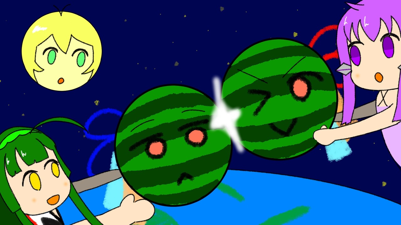 スイカとスイカが一つになり…やがて星が誕生した。<br><br><農協><br><strong>ざざま座 様 </strong><span style="color: #0000ff;"><strong><u><a href="https://www.nicovideo.jp/user/48539486" target="_blank" rel="noopener">user/48539486</a></u></strong></span><br>別視点⇒ <span style="color: #0000ff;"><u><a href="https://www.nicovideo.jp/watch/sm44283734" class="watch">sm44283734</a></u></span><br><br><strong>出演</strong><br><span style="color: #38761d;"><strong>東北ずん子(VOICEROID +EX)</strong></span><strong> 立ち絵:トモアツ 様</strong><br><span style="color: #9900ff;"><strong>結月ゆかり(A.I.VOICE)</strong></span><strong> 立ち絵:Noname 様</strong><br><span style="color: #bf9000;"><strong>弦巻マキ(VOICEROID+EX)</strong></span><strong> 立ち絵:Noname 様</strong><br><br><br>【PART1まとめ】<br><a href="https://www.nicovideo.jp/mylist/75015813" target="_blank" rel="noopener">mylist/75015813</a><br><br>【Twitter】<br><a href="https://twitter.com/iwashimizu_134" target="_blank" rel="noopener nofollow">https://twitter.com/iwashimizu_134</a><br>