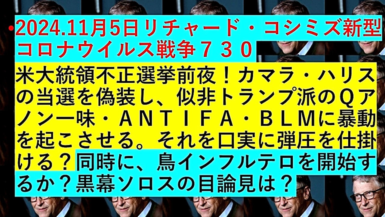<span style="color: #cc0000;"><strong>◐【 テーマ : 新型コロナウイルス戦争⦅ 732 ⦆⦅ 暫定版 ⦆】</strong></span><br><br> <span style="color: #ff0000;"><strong>「『 米大統領・不正選挙 』前夜!『 カマラ・ハリス 』の『 当選 』を『 偽装 』し、『 似非トランプ派 』の『 Qアノン一味 』・<br> 『 ANTIFA 』・『 BLM 』に『 暴動 』を起こさせる。それを『 口実 』に『 弾圧 』を仕掛ける?『 同時 』に、『 鳥インフル<br> エンザ・テロ 』を『 開始 』するか?『 黒幕 ジョージ・ソロス 』の『 目論見 』は? 」</strong></span><br><br> <span style="color: #38761d;"><strong>◐『 リチャード・コシミズ 書籍 :「 2024年 鳥インフルH5N1バイオテロを生き抜くために 」』</strong></span><br><span style="color: #0000ff;"><strong> <a href="https://x.gd/AG1bf" target="_blank" rel="noopener nofollow">https://x.gd/AG1bf</a></strong></span><br><br> <span style="color: #38761d;"><strong>◐ 『 リチャード・コシミズ・チャンネル⦅ ニコニコ チャンネル ⦆』</strong></span><br><span style="color: #0000ff;"><strong> <a href="https://ch.nicovideo.jp/richardkoshimizu" target="_blank" rel="noopener nofollow">https://ch.nicovideo.jp/richardkoshimizu</a></strong></span><br><br><span style="color: #38761d;"><strong> ◐ 『 リチャード・コシミズ ニコニコ生放送⦅ LIVE ⦆』</strong></span><br><span style="color: #0000ff;"><strong> <a href="https://www.nicovideo.jp/user/120930363/live_programs" target="_blank" rel="noopener nofollow">https://www.nicovideo.jp/user/120930363/live_programs</a></strong></span><br><br> <span style="color: #38761d;"><strong>◐ 『 リチャード・コシミズ「 Rumble 」公式 動画ギャラリー 』</strong></span><br><span style="color: #0000ff;"><strong> <a href="https://rumble.com/user/richardkoshimizu" target="_blank" rel="noopener nofollow">https://rumble.com/user/richardkoshimizu</a></strong></span><br><br>