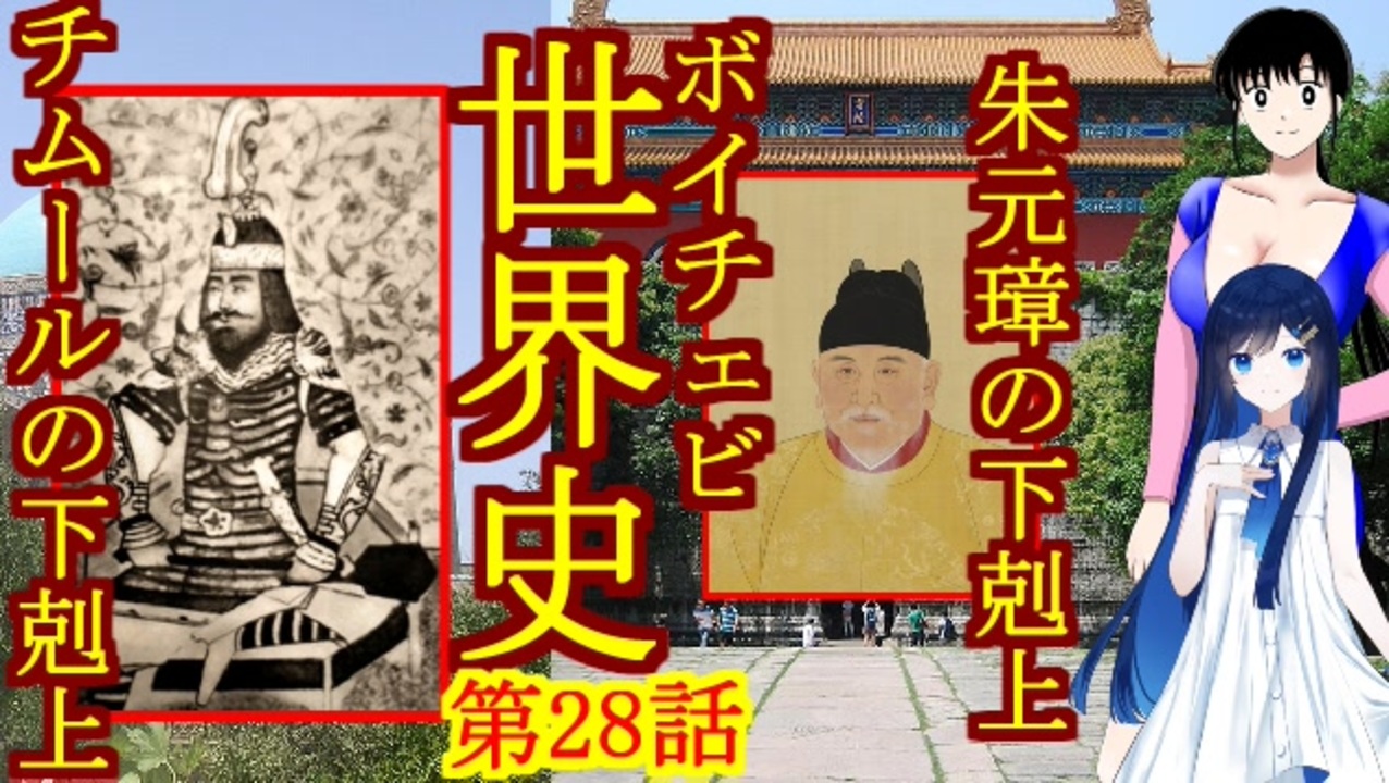 日テレ系「まんが日本史」をオマージュし、<br>学習漫画「世界の歴史」を教科書とした<br>ボイチェビ世界史 第28回は、<br>明王朝を立ち上げた朱元璋と、<br>モンゴル帝国最高実力者にのし上がったチムールの、<br>中世末期の下剋上について解説します。<br><br>「歴史学者・ことりさん」が、<br>no.7(voicevox)の声でご案内いたします。<br>そしてアシスタントに双葉湊音ちゃんを起用。<br><br>EDテーマ「風のメルヘン」は、<br>第28(ふたば)話のため、<br>双葉湊音ちゃんに歌ってもらいます。<br><br>注意点<br>・セリフおよび画像は、その一部は教科書など参考文献から<br>引用させていただくことがあります。<br>・演出のために、舞台の時代にそぐわない画像や<br>音楽を使う場合がございます。<br>・セリフ発声はすべて合成音声<br>・BGMは、他者作成のBGMや音楽を借ります。<br>・若干の表記ゆれはご容赦ください。<br>・親作品は動画最後のスタッフロール画面に掲載します。<br><br>みどころ<br>1:37 朱元璋とチムールの誕生!!<br><a href="https://www.nicovideo.jp/watch/sm44293804?from=97" target="_blank" rel="noopener nofollow">https://www.nicovideo.jp/watch/sm44293804?from=97</a><br><br>3:28 朱元璋、牛を奪って焼肉<br><a href="https://www.nicovideo.jp/watch/sm44293804?from=206" target="_blank" rel="noopener nofollow">https://www.nicovideo.jp/watch/sm44293804?from=206</a><br><br>6:06 紅巾の乱、勃発!元王朝崩壊へ!<br><a href="https://www.nicovideo.jp/watch/sm44293804?from=366" target="_blank" rel="noopener nofollow">https://www.nicovideo.jp/watch/sm44293804?from=366</a><br><br>12:18 元王朝、中華王朝としては滅亡、北元王朝へ<br><a href="https://www.nicovideo.jp/watch/sm44293804?from=738" target="_blank" rel="noopener nofollow">https://www.nicovideo.jp/watch/sm44293804?from=738</a><br><br>14:51 チムール帝国の領土拡大を簡単に<br><a href="https://www.nicovideo.jp/watch/sm44293804?from=891" target="_blank" rel="noopener nofollow">https://www.nicovideo.jp/watch/sm44293804?from=891</a><br><br>19:35 ???<br><a href="https://www.nicovideo.jp/watch/sm44293804?from=1175" target="_blank" rel="noopener nofollow">https://www.nicovideo.jp/watch/sm44293804?from=1175</a>