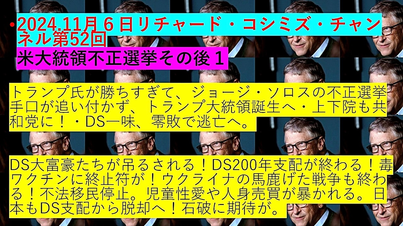 <span style="color: #cc0000;"><strong>◐『 リチャード・コシミズ・チャンネル⦅ 第52回放送 ⦆⦅ 暫定版 ⦆』</strong></span><br><br> <span style="color: #ff0000;"><strong>『 米国大統領不正選挙 その後 ① 』</strong></span><br><br> <span style="color: #ff0000;"><strong>「『 ドナルド・トランプ氏 』が『 勝ち 』過ぎて、『 ジョージ・ソロス 』の『 不正選挙手口 』が追い付かず、<br> 『 ドナルド・トランプ大統領誕生へ 』・『 上下院も共和党に! 』・『 DEEP STATE一味、零敗で逃亡へ 』」</strong></span><br><br> <span style="color: #ff0000;"><strong>「『 DEEP STATE大富豪 』たちが『 吊るされる 』!『 DEEP STATE 200年支配 』が終わる!『 毒ワク<br> チン 』に『 終止符 』が!『 ウクライナ 』の馬鹿げた『 戦争 』も終わる!『 不法移民停止 』。『 児童<br> 性愛 』や『 人身売買 』が『 暴かれる 』。『 日本 』も『 DEEP STATE支配 』から『 脱却 』へ!『 石<br> 破茂氏 』に『 期待 』が 」</strong></span><br><br> <span style="color: #38761d;"><strong>◐『 リチャード・コシミズ 書籍 :「 2024年 鳥インフルH5N1バイオテロを生き抜くために 」』</strong></span><br><span style="color: #0000ff;"><strong> <a href="https://x.gd/AG1bf" target="_blank" rel="noopener nofollow">https://x.gd/AG1bf</a></strong></span><br><br> <span style="color: #38761d;"><strong>◐ 『 リチャード・コシミズ・チャンネル⦅ ニコニコ チャンネル ⦆』</strong></span><br><span style="color: #0000ff;"><strong> <a href="https://ch.nicovideo.jp/richardkoshimizu" target="_blank" rel="noopener nofollow">https://ch.nicovideo.jp/richardkoshimizu</a></strong></span><br><br>