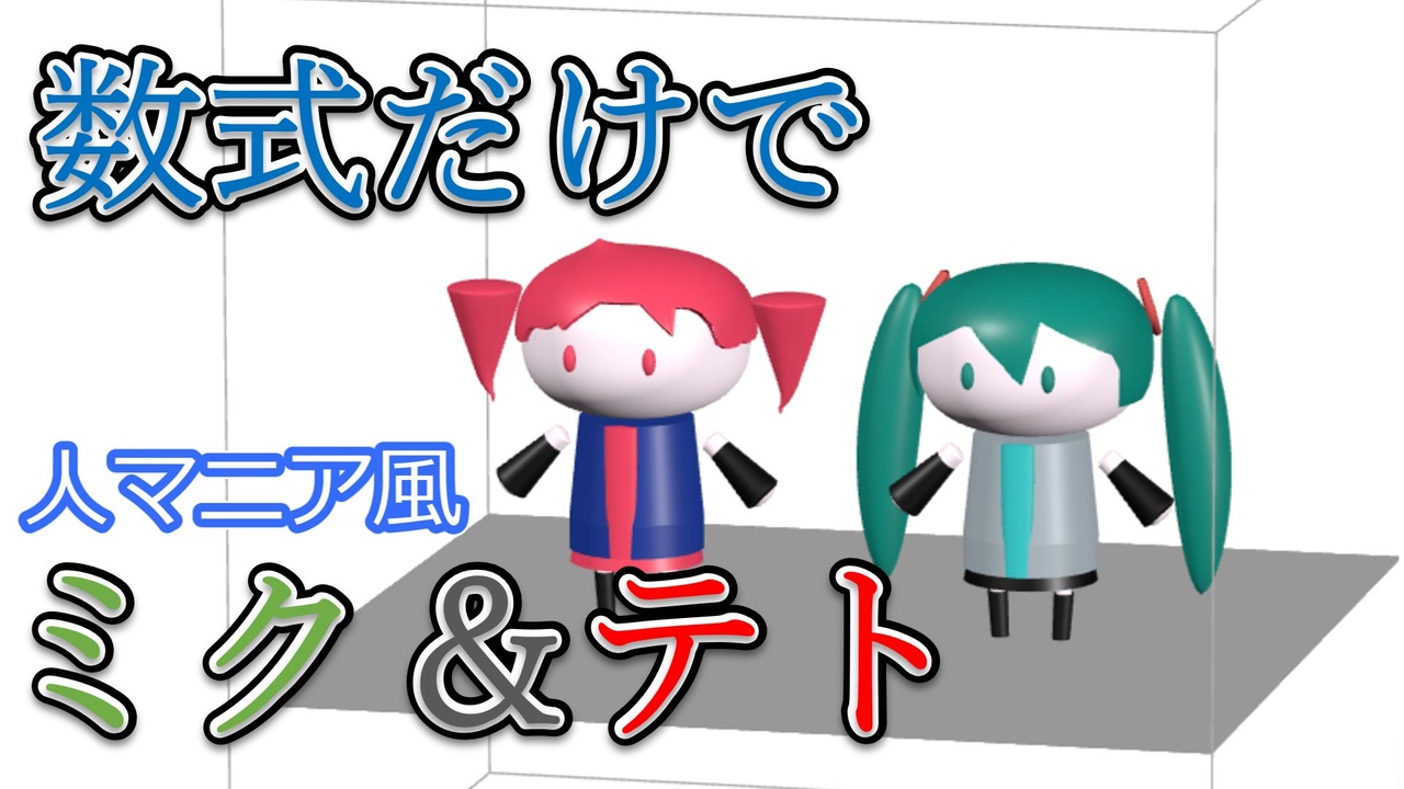 ニコニコ動画にアップロードし忘れていた動画です。<br>(ニコニコが止まってて忘れていたやつ)<br><br>これはグラフを描くための教育用ソフト「desmos」を使って作られています。 本来は数学の学習に用いるツールですが、私はグラフを使って絵や動画を作っています。 ↓今回作成した関数アートの数式を公開しています <a href="https://www.desmos.com/3d/4rupf8stty" target="_blank" rel="noopener nofollow">https://www.desmos.com/3d/4rupf8stty</a> __________________________________________________________________ <br>その他、使用したもの ↓解説パートのBGM:「キミにあげる!」MusMus様 <a href="https://youtu.be/9bYPpAEgCzo?si=2SWX82-t4d5mzNPk" target="_blank" rel="noopener nofollow">https://youtu.be/9bYPpAEgCzo?si=2SWX82-t4d5mzNPk</a> ↓動画編集アプリ:ゆっくりムービーメーカー4 <a href="https://manjubox.net/ymm4/" target="_blank" rel="noopener nofollow">https://manjubox.net/ymm4/</a> <br>__________________________________________________________________ <br>グラフで作ってほしいものがあったらコメント欄で教えてください。 (実現できるかどうかわかりませんが)参考にします。