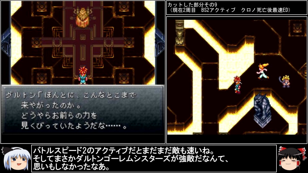 2周目のpart2です。<br>回復手段がないと、道中の雑魚戦だけでも意外と削られるものですね。<br>最速逃走でもダメージくらいそうですし、やっぱり1周目はシェルター必須かも(掌クルクル)<br><br>ラヴォスコア戦で時空転換を封じてみた→<a href="https://www.nicovideo.jp/watch/sm39823170" class="watch">sm39823170</a><br>前→<a href="https://www.nicovideo.jp/watch/sm44303557" class="watch">sm44303557</a><br>次→<a href="https://www.nicovideo.jp/watch/sm44331451" class="watch">sm44331451</a><br><br>YouTube版→<a href="https://youtu.be/rBbjHwj8Cxs" target="_blank" rel="noopener nofollow">https://youtu.be/rBbjHwj8Cxs</a><br><br>縛りルール<br>①一度使った武器・防具・アクセサリー・道具・技・連携は<br> 次周回以降使用禁止(売却も解禁扱い)<br><br>②一度戦った敵シンボルとの再戦禁止。<br><br>③初戦闘の敵からの逃走禁止。<br><br>④裏技、バグ技、状況再現禁止。<br><br>⑤BS1アクティブからBS8ウェイトまで<br> 全てのバトルスピードとバトルモードで攻略する。<br><br>⑥各周回において見る予定のED条件を<br> 満たした段階で即ラヴォスと戦いに行く。<br><br>※ネタバレ注意です<br><br>このページ、動画で利用している弊社または弊社のライセンサーが権利を有する著作物の転載・配布は禁止いたします。<br>© 1995, 2018 SQUARE ENIX<br>Illustration: © 1995 BIRD STUDIO / SHUEISHA<br>Story and Screenplay: © 1995, 2008 ARMOR PROJECT / SQUARE ENIX<br><br>AquesTalk2ライセンスID:AQTK2WINUSR23122185<br /><br><br>❤いいねを押していただけるとモチベーションと投稿速度が上がるので宜しくお願い致します!<br><br>作者ツイッター→ <a href="https://twitter.com/nig0117" target="_blank" rel="noopener nofollow">https://twitter.com/nig0117</a><br>PIXIV FANBOX→ <a href="https://sutanokeiji.fanbox.cc/" target="_blank" rel="noopener nofollow">https://sutanokeiji.fanbox.cc/</a><br><br>( 以前はWEB小説書いてました→ <a href="https://kakuyomu.jp/works/1177354054884910267" target="_blank" rel="noopener nofollow">https://kakuyomu.jp/works/1177354054884910267</a> )