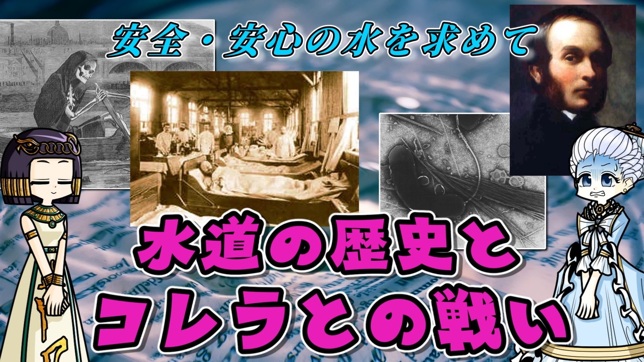 飲み水のビジネスってすごい市場みたいですね。ミネラルウォーター、ウォーターサーバー、蛇口につける浄水器とか… <br>でもでもね、日本の水道水って実はそのまま飲めるんですよ。 <br>とはいえ田舎者の中の人は東京の水とか口に含むとちょっと違和感を感じちゃうんですが。 <br>ともあれ、こんなに安全な水が飲めるようになったのは、先人たちの多大なる犠牲があってこそのものだったみたいですよ。 <br><br>☆ニコニコチャンネル「モンド・ヒストリカの離宮」 →<a href="https://ch.nicovideo.jp/mond-historica" target="_blank" rel="noopener nofollow">https://ch.nicovideo.jp/mond-historica</a> <br><br>今回の主要参考文献: <br>福田眞人(2024)『水と清潔 風呂・トイレ・水道の比較文化史』朝日新聞出版<br>スティーブン・ジョンソン(2017)『感染地図 歴史を変えた未知の病原体』矢野真知子訳 河出書房 <br>ウィリアム・H・マクニール(2007)『疫病と世界史』中央公論新社<br>スティーブン・ジョンソン(2024)『世界をつくった6つの革命の物語』大田直子訳 朝日新聞出版 <br>ルース・ドフリース(2021)『食糧と人類 飢餓を克服した大増産の文明史』小川敏子訳 日経BP <br>国土交通省「令和5年版 日本の水資源の現況」<a href="https://www.mlit.go.jp/mizukokudo/mizsei/content/001737484.pdf" target="_blank" rel="noopener nofollow">https://www.mlit.go.jp/mizukokudo/mizsei/content/001737484.pdf</a> <br>加藤茂孝(2016) 「人類と感染症との戦い 第7回 「コレラ」 激しい脱水症状」モダンメディア 62巻6号 31-42 <a href="https://www.eiken.co.jp/uploads/modern_media/literature/MM1606_06.pdf" target="_blank" rel="noopener nofollow">https://www.eiken.co.jp/uploads/modern_media/literature/MM1606_06.pdf</a> <br><br>その他 Wikipediaなど<br />━━━━━━━━━━━━━━━━━━━━━<br><br>この動画はクリエイティブ・コモンズ継承(CC-BY-SA)ライセンスの素材を使用して制作しています。(<a href="https://creativecommons.org/licenses/by-sa/4.0/)" target="_blank" rel="noopener nofollow">https://creativecommons.org/licenses/by-sa/4.0/)</a><br>規約に基づき、この動画もCC-BY-SA 4.0 のもとで公開します。<br><br>投稿者共通情報☆彡<br><br>BGM, SE:ニコニ・コモンズ様<br><a href="http://commons.nicovideo.jp/" target="_blank" rel="noopener nofollow">http://commons.nicovideo.jp/</a><br>魔王魂様<br><a href="https://maoudamashii.jokersounds.com/" target="_blank" rel="noopener nofollow">https://maoudamashii.jokersounds.com/</a><br>Audiostock様<br><a href="https://audiostock.jp/" target="_blank" rel="noopener nofollow">https://audiostock.jp/</a><br><br>立ち絵 霊夢・魔理沙(黒子式):nicotalk様<br><a href="http://www.nicotalk.com/charasozai.html" target="_blank" rel="noopener nofollow">http://www.nicotalk.com/charasozai.html</a><br><br>立ち絵 パトラ、マリー、アン、メアリ:ライフライフ様<br><a href="https://0801lifelife.tumblr.com/" target="_blank" rel="noopener nofollow">https://0801lifelife.tumblr.com/</a><br><br>使用ツール1:ゆっくりムービーメーカー4<br><a href="https://manjubox.net/ymm4/" target="_blank" rel="noopener nofollow">https://manjubox.net/ymm4/</a><br><br>使用ツール2:AviUtl<br><a href="http://spring-fragrance.mints.ne.jp/aviutl/" target="_blank" rel="noopener nofollow">http://spring-fragrance.mints.ne.jp/aviutl/</a><br><br>各時代の地図 : World History Maps & Timelines <br><a href="http://geacron.com/home-en/" target="_blank" rel="noopener nofollow">http://geacron.com/home-en/</a><br><br>ゆっくりボイスについて:AquesTalkライセンス取得済み<br><br>キャラクターボイス<br>アン・ボニー:羽ノ華(A.I.VOICE)<br>メアリ・リード:琴葉 葵(A.I.VOICE)<br>クレオパトラ:結月ゆかり(VOICEROID2)<br>マリー‐アントワネット:東北きりたん (VOICEROID EX)<br>その他キャラ:青山龍星(A.I.VOICE)、伊織弓鶴(A.I.VOICE2)、栗田まろん(A.I.VOICE)、宮舞モカ(VOICEPEAK)、フリモメン(VOICEPEAK)<br><br><br><br>その他フリー素材ご提供元の皆様に圧倒的感謝<br>