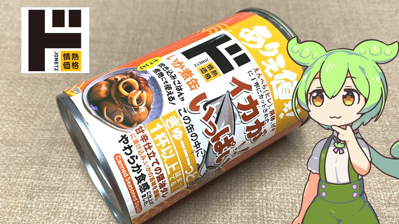 ドン・キホーテに行ったら、美味しそうな缶詰があったので買ってみました。<br><br><br>【参考】<br> いかの煮つけ4号缶410g(ドン・キホーテ)<br> <a href="https://www.donki.com/j-kakaku/product/detail.php?item=4692" target="_blank" rel="noopener nofollow">https://www.donki.com/j-kakaku/product/detail.php?item=4692</a><br> 天長食品工業株式会社<br> <a href="https://tencho.co.jp/" target="_blank" rel="noopener nofollow">https://tencho.co.jp/</a> <br>うれしい値!宣言(セブンイレブン)<br> <a href="https://www.sej.co.jp/products/ureshiine.html" target="_blank" rel="noopener nofollow">https://www.sej.co.jp/products/ureshiine.html</a><br><br>【使用した素材】(※敬称略) <br>(合成音声)VOICEVOX/ずんだもん/四国めたん/春日部つむぎ <br><a href="https://voicevox.hiroshiba.jp/" target="_blank" rel="noopener nofollow">https://voicevox.hiroshiba.jp/</a> <br>(立ち絵)坂本アヒル<br> <a href="https://seiga.nicovideo.jp/seiga/im10788496?track" target="_blank" rel="noopener nofollow">https://seiga.nicovideo.jp/seiga/im10788496?track</a> <br>(楽曲)甘茶の音楽工房/「楽しい麦畑」「フルーツパフェ」「お城の舞踏会」「残業戦士」 <br><a href="https://amachamusic.chagasi.co" target="_blank" rel="noopener nofollow">https://amachamusic.chagasi.co</a>