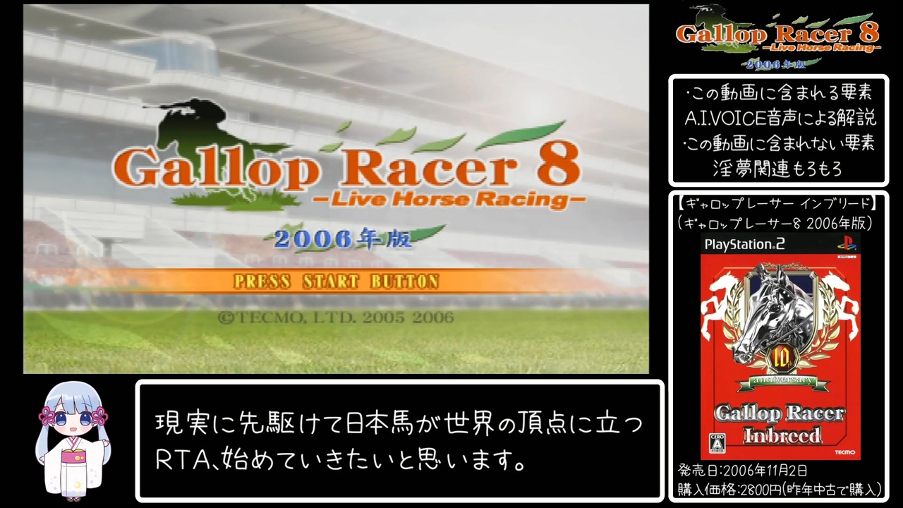 2004年にゼンノロブロイ号がJRA賞年度代表馬に輝いてから早20年、未だ1度たりとも<br>その名を冠した競走が中央競馬で開催される気配がないので怒りの初投稿です。<br><br>先人のRTA動画に内容で負けないよう、しっかり走り切って簡易ながら編集も加えました。<br>本来は今年の凱旋門賞開催までに投稿予定だった当動画ですが、どうか再生時間分くらいは楽しんでいただければ幸いです。<br><br>【プレイ環境、及び録画編集時の使用機材、素材等】<br>PS2(SCPH-70000)、純正コントローラー<br>PS2用HDMIコンバーターV2(コロンバスサークル製)<br>PRO MP242C(MSI製モニター)<br>HDMIキャプチャーボード 15390A(UGREEN製)<br>OBS Studio<br>AviUtl<br>A.I.VOICE2 つくよみちゃん<br>声素材(夢前黎様 <a href="https://www.rei-yumesaki.net/" target="_blank" rel="noopener nofollow">https://www.rei-yumesaki.net/</a> )<br>つくよみちゃん万能ミニキャラ素材(きばやし様)<br>073 TEGUSE - Kanaka Font<br>動画終盤に使用したキャプチャ元→<a href="https://www.nicovideo.jp/watch/sm42963720" class="watch">sm42963720</a>