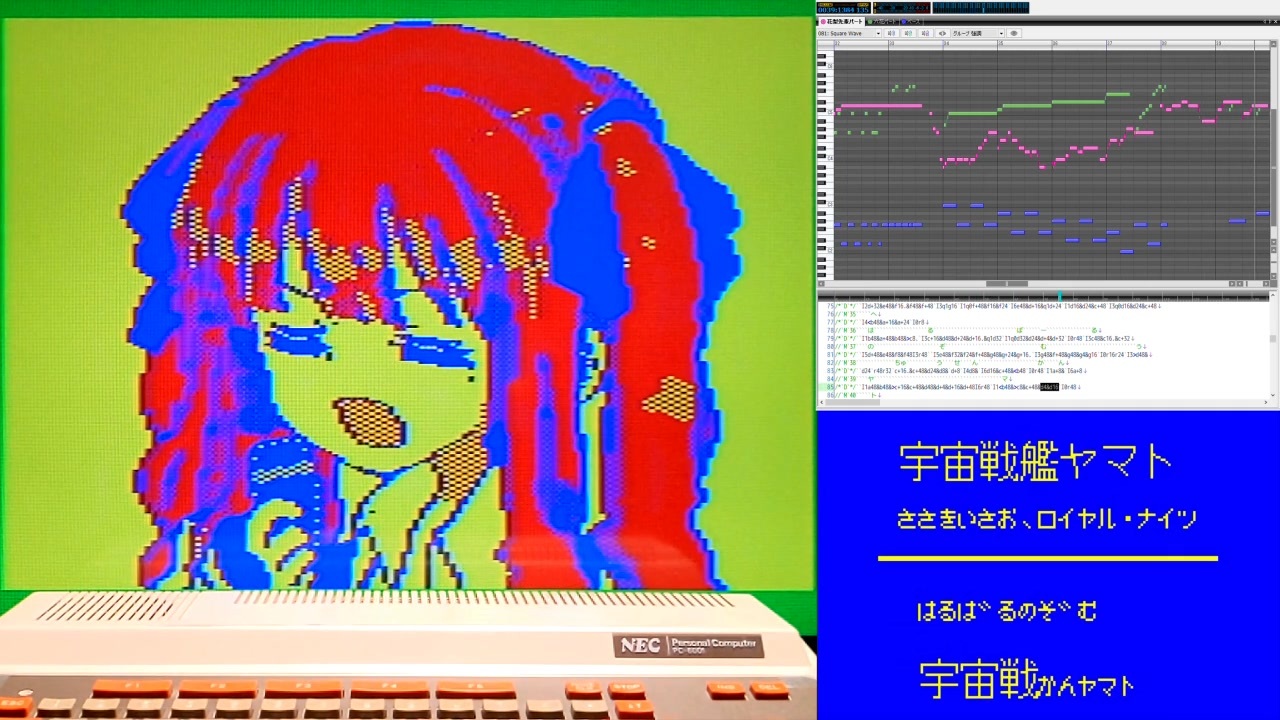 ビームマンPの元動画 (<a href="https://www.nicovideo.jp/watch/sm43594193" class="watch">sm43594193</a>) のコメで<br><strong>「後ろの人よく聴いたら歌上手いな」<br>「六花にすべて持ってかれてる」</strong><br>などと言われていた花梨先輩をもっと応援したくて作りました。<br><br>最初にPC-6001用4色画像を作ってみたところ思いのほかいい感じだったので、以前から練習しようと思っていたPSG楽曲向け耳コピ採譜をやってみて、ついでに元動画でも評判だったリップシンクの画像も作ってできるだけ設定してみました。<br><br>ピアノロールは、実機演奏で使用したPSG音源ドライバ用MMLソースに対してパート指定文字列とテンポだけ修正したものを3MLEに入力して、実機演奏と同じ速さになるように再生したキャプチャを重ねています。<br><br>歌詞字幕は <a href="https://www.nicovideo.jp/watch/sm16460780" class="watch">sm16460780</a> 「PC-6601で大きな古時計の替歌った時に画面を書いたプログラム」をダウンロードして改修したものをエミュレータPC6001VXのPC-6001mkIIエミュで動かして表示しています。曲タイトルの「艦」とカタカナはPC-6001の漢字ROMに無いのでビットマップ描画です。<br><br><strong>■使用素材</strong><br>宇宙戦艦ヤマトを熱唱する花梨先輩 feat.小春六花 ビームマンPさん <a href="https://www.nicovideo.jp/watch/sm43594193" class="watch">sm43594193</a><br>夏色花梨 フリー立ち絵素材 1.03 沿線電話機 外箱さん <a href="https://seiga.nicovideo.jp/seiga/im10924527" target="_blank" rel="noopener">im10924527</a><br>花隈千冬立ち絵素材Ver1.0 ななしのののつさん <a href="https://seiga.nicovideo.jp/seiga/im11294795" target="_blank" rel="noopener">im11294795</a><br><br><strong>■使用ツール</strong><br>画像変換 for PC-6001 まひなさん<br>TINY Bitmap Converter α0.2.7 TINY野郎さん <br>GIMP 2.10.38<br><br>YorkTrail v1.0.5 thetaさん <a href="https://www.nicovideo.jp/watch/sm41987405" class="watch">sm41987405</a><br>WaveTone ver.2.71 ackieさん <a href="https://www.nicovideo.jp/watch/sm11168832" class="watch">sm11168832</a><br>3ML EDITOR v2.0.3 Build 783 ALOEさん<br>PC-6001mk2/SR/6601/SR PSG音源ドライバ ver1.1c よっしゅさん<br>MML2P6PSGDRV ver 0.3.0 TINY野郎さん<br><br>PC6001VX 4.2.9 eighttailsさん<br>Macroassembler AS 1.42 Bld 278 Alfred Arnoldさん<br>txt2bas Ver.0.7 isioさん<br>なんでもピーガーmkII v1.33 TINY野郎さん<br><br>PC-6601で大きな古時計の替歌った時に画面を描いたプログラム haydnさん <a href="https://www.nicovideo.jp/watch/sm16460780" class="watch">sm16460780</a>
