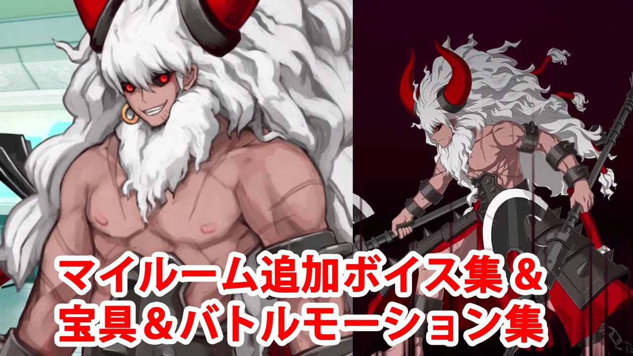 期間限定イベント「ぶち壊せ! ミステリーハウス・クラフターズ ~星の鉱員と日の出の翼~」の<br>モーションリニューアルに合わせて追加されたアステリオス(CV:鳥海浩輔)のマイルーム会話とバトルボイスのまとめと<br>リニューアルされた全バトルモーション(攻撃、スキル、EXアタック、宝具)のまとめです。<br><br>宝具「万古不易の迷宮(ケイオス・ラビュリントス)」<br><br>【チャプター】<br><a href="#" class="seekTime" data-seekTime="0:00" onclick="seekNicoPlayer('#0:00'); return false;">#0:00</a> 追加マイルームボイス<br><a href="#" class="seekTime" data-seekTime="1:03" onclick="seekNicoPlayer('#1:03'); return false;">#1:03</a> 追加レベルアップボイス<br><a href="#" class="seekTime" data-seekTime="1:12" onclick="seekNicoPlayer('#1:12'); return false;">#1:12</a> バトルキャラ表示<br><a href="#" class="seekTime" data-seekTime="1:43" onclick="seekNicoPlayer('#1:43'); return false;">#1:43</a> バトルボイス<br><a href="#" class="seekTime" data-seekTime="2:43" onclick="seekNicoPlayer('#2:43'); return false;">#2:43</a> リニューアル版モーション<br><br>YouTube版はこちら<br><a href="https://www.youtube.com/watch?v=fol0pntd4b4" target="_blank" rel="noopener nofollow">https://www.youtube.com/watch?v=fol0pntd4b4</a><br><br />投稿済ボイス集→<a href="https://www.nicovideo.jp/mylist/57873980" target="_blank" rel="noopener">mylist/57873980</a>、<a href="https://www.nicovideo.jp/mylist/68037946" target="_blank" rel="noopener">mylist/68037946</a>、<a href="https://www.nicovideo.jp/mylist/76708013" target="_blank" rel="noopener">mylist/76708013</a>