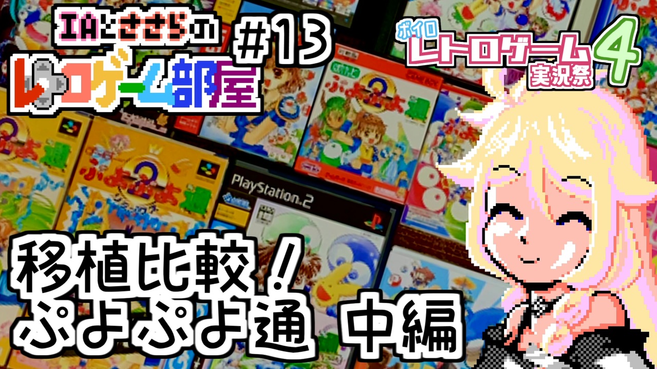 <span style="color: #ff0000;">※本動画はぷっくら様(<a href="https://www.nicovideo.jp/user/295540" target="_blank" rel="noopener">user/295540</a>)主催の「ボイロレトロゲーム実況祭4(<a href="https://www.nicovideo.jp/watch/sm44077998" class="watch">sm44077998</a>)」への投稿動画です。</span><br><br>IAちゃんがささらちゃんにオススメのゲームを紹介します。<br>前回に引き続き様々な機種で発売されたぷよぷよ通を順番にご紹介。<br>移植の度に進化していくぷよ通の遍歴をお楽しみください。<br><br>※「ぷよぷよ通決定盤」のタイトルについて、動画全編に渡り「決定版」と誤表記してしまっていました。大変申し訳ありません。<br><br><br>〇今回のレトロゲーム<br>・タイトル:ぷよぷよ通<br>・ハード:SFC、PCE、PS、Windows95<br>・発売日:1995年12月8日他<br>・開発・発売:コンパイル、他<br>©SEGA<br><br>前回#12(ぷよ通前編)→<a href="https://www.nicovideo.jp/watch/sm44259957" class="watch">sm44259957</a><br>次回#14(ぷよ通後編)→<a href="https://www.nicovideo.jp/watch/sm44823039" class="watch">sm44823039</a>(3.30 12:00)<br><br><br>◎動画の方向性、注意事項について<br>・うp主が好きなレトロゲームを紹介する動画です。<br>・カット編集多めです。<br>・寸劇や茶番を含みます。<br>・うp主は90年代以前のゲームをリアルタイムで遊んだ世代ではありません。<br><br><br>〇出演(CeVIO AI)<br>・IA -ARIA ON THE PLANETES-<br>・さとうささら<br><br>〇使用素材<br>・BGM・効果音 「seadenden 8bit freeBGM」<br> URL:<a href="http://seadenden-8bit.com" target="_blank" rel="noopener nofollow">http://seadenden-8bit.com</a><br><br>・フォント「りいポップ角」<br> URL:<a href="http://aoirii.babyblue.jp/font/" target="_blank" rel="noopener nofollow">http://aoirii.babyblue.jp/font/</a><br><br><br>・立ち絵、背景等 自作<br><br><br>〇使用ツール<br>・編集ソフト「AviUtl」<br>・プラグイン「PSDToolKit」<br><br><br>〇投稿している動画達<br>「ゲームの小部屋」→<a href="https://www.nicovideo.jp/series/500805" target="_blank" rel="noopener">series/500805</a><br>「IAとささらのレトロゲーム部屋」→<a href="https://www.nicovideo.jp/series/295424" target="_blank" rel="noopener">series/295424</a><br>シリーズPart1リンク→<a href="https://www.nicovideo.jp/mylist/74015157" target="_blank" rel="noopener">mylist/74015157</a><br>R/T/A→<a href="https://www.nicovideo.jp/series/322036" target="_blank" rel="noopener">series/322036</a><br>その他単発→<a href="https://www.nicovideo.jp/series/350117" target="_blank" rel="noopener">series/350117</a><br><br>