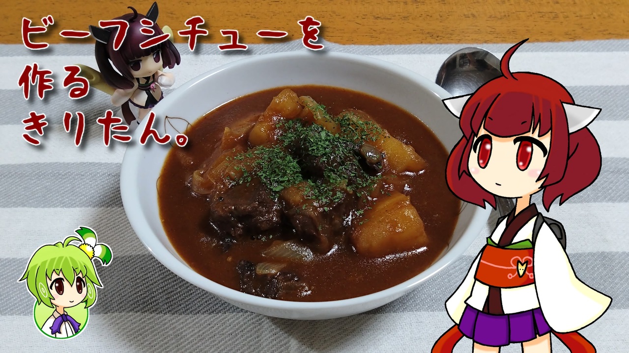 この正統派なビーフシチューを作るために、これまで変わり種のビーフストロガノフ、ハヤシライス、ハッシュドビーフを作り続けてきた気がします。<br>多分きっとそうだったはずです。<br><br>実際それぞれ全く違った味わいの料理に仕上がっているので、皆様もよろしければ作り比べてみてください。<br><br>ビーフストロガノフを作るきりたん。→<a href="https://www.nicovideo.jp/watch/sm40548496" class="watch">sm40548496</a><br>ハヤシライスを作るきりたん。→<a href="https://www.nicovideo.jp/watch/sm41607602" class="watch">sm41607602</a><br>ハッシュドビーフを作るきりたん。→<a href="https://www.nicovideo.jp/watch/sm42801442" class="watch">sm42801442</a><br><br>※きりたんの炊飯器は、特記がない限り5.5合炊きのものを使用しています。<br><br>こちらのレシピを参考にさせて頂きました↓<br><a href="https://www.tenukitchen.com/entry/2019/12/14/204737" target="_blank" rel="noopener nofollow">https://www.tenukitchen.com/entry/2019/12/14/204737</a>