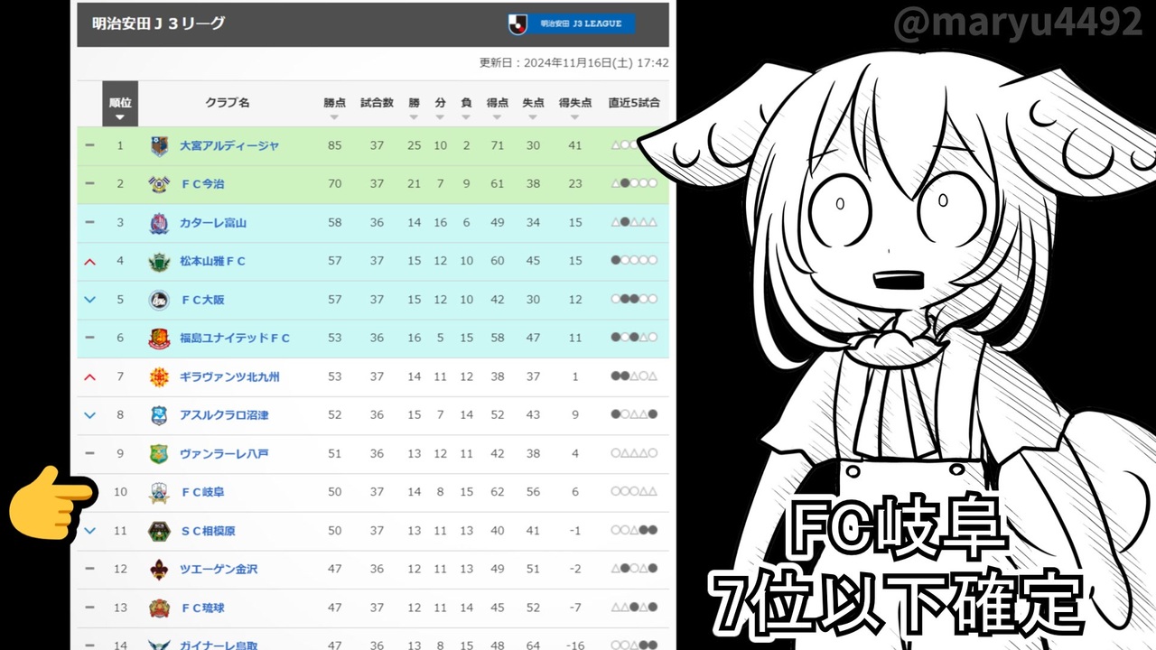 2024シーズンのJ3も残り2節 <br>FC岐阜はこの試合がホーム最終戦となるので <br>いつもより多くの方が競技場に訪れていました。 <br><br><br>【関連動画】 <br>【FC岐阜観戦記】2024J3第32節 FC岐阜vsAC長野パルセイロ 2024.10.13<br><a href="https://www.nicovideo.jp/watch/sm44208650" target="_blank" rel="noopener nofollow">https://www.nicovideo.jp/watch/sm44208650</a><br><br> 【参考】<br> 明治安田J3リーグ第37節 岐阜vs大宮(Jリーグ公式) <br><a href="https://www.jleague.jp/match/j3/2024/111602/live/#live" target="_blank" rel="noopener nofollow">https://www.jleague.jp/match/j3/2024/111602/live/#live</a> <br>Jリーグ<br> <a href="https://www.jleague.jp/" target="_blank" rel="noopener nofollow">https://www.jleague.jp/</a><br> 岐阜メモリアルセンター <br><a href="https://gifu-sports.org/gmc/" target="_blank" rel="noopener nofollow">https://gifu-sports.org/gmc/</a><br><br>【使用した素材】(※敬称略) <br>(合成音声)VOICEVOX/ずんだもん/四国めたん<br> <a href="https://voicevox.hiroshiba.jp/" target="_blank" rel="noopener nofollow">https://voicevox.hiroshiba.jp/</a> <br>(立ち絵)坂本アヒル<br> i<a href="https://seiga.nicovideo.jp/seiga/m10788496/im10791276" target="_blank" rel="noopener nofollow">https://seiga.nicovideo.jp/seiga/m10788496/im10791276</a> <br>(立ち絵2)おがりや<br><a href="https://seiga.nicovideo.jp/seiga/im11135221" target="_blank" rel="noopener nofollow">https://seiga.nicovideo.jp/seiga/im11135221</a><br>(楽曲)甘茶の音楽工房/「日々是好日」<br> <a href="https://amachamusic.chagasi.com" target="_blank" rel="noopener nofollow">https://amachamusic.chagasi.com</a><br>