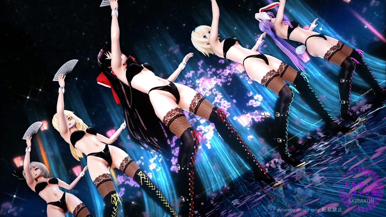 霊夢・魔理沙・アリス・鈴仙・妖夢の5人に踊ってもらいました。この作品は「東方project」の2次創作です。現在、作成リクエストは受け付けていません。<br><br><br>【楽曲】:「トキヲ・ファンカ」: takamatt様 <a href="https://www.nicovideo.jp/watch/sm20973557" class="watch">sm20973557</a><br><br>【トレース元】:足太ぺんた様 <a href="https://www.nicovideo.jp/watch/sm28576935" class="watch">sm28576935</a><br><br>【モーション・カメラ】:アガちん様 <a href="https://www.nicovideo.jp/watch/sm30269111" class="watch">sm30269111</a><br><br><br>■スカイドーム<br>夜の森_AL:ゆづき様<br><br>■ステージ<br>千本鳥居風ステージ:torisutsuki様 <a href="https://seiga.nicovideo.jp/seiga/im6256482" target="_blank" rel="noopener">im6256482</a><br>墨筆ステージ:一護牛乳様 <a href="https://seiga.nicovideo.jp/seiga/im10759848" target="_blank" rel="noopener">im10759848</a><br>滝桜ステージ:ゆづき様<br><br>■モデル<br>霊夢、魔理沙、アリス:にがもん様、しえら様<br>FL改_鈴仙・U・イナバ_v4.10:フリック様 <a href="https://www.nicovideo.jp/watch/sm19270846" class="watch">sm19270846</a><br>魂魄妖夢:アールビット様<br>衣装:アールビット様<br>扇子PMD改造モデル:アガちん様 <a href="https://www.nicovideo.jp/watch/sm30269111" class="watch">sm30269111</a><br><br>■エフェクト<br>Ray-mmd-1.5.2:Rui様<br>初心者マテリアル:さらしな様<br>肌マテリアル:MARUSU様<br>AutoLuminous4:そぼろ様<br>流体水面エフェクト:ビームマンP様<br>空中に漂う埃:化身バレッタ様<br>ikBokeh_v020a:ikeno様<br><br><br>MikuMikuDance:樋口優様<br>MMEffect :舞力介入P様<br>PMDE、PmxE:極北P様<br>AviUtl :KENくん様<br>・Aviutl + x264guiExでエンコード:rigaya様<br>Ut Video Codec Suite:ゆーむP様<br>上海アリス幻楽団・東方project(ZUN様)<br><br><br>mylist ③<a href="https://www.nicovideo.jp/mylist/75586824" target="_blank" rel="noopener">mylist/75586824</a> ② <a href="https://www.nicovideo.jp/mylist/72970530" target="_blank" rel="noopener">mylist/72970530</a> ① <a href="https://www.nicovideo.jp/mylist/63690967" target="_blank" rel="noopener">mylist/63690967</a> 旧 <a href="https://www.nicovideo.jp/mylist/61238351" target="_blank" rel="noopener">mylist/61238351</a><br><br> ※動画の転載は禁止です。 <br>Attention,Unauthorized reproduction prohibited!!