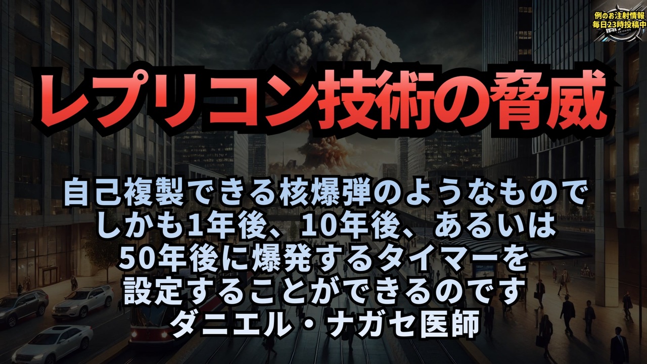 ダニエル・ナガセ医師がレプリコン技術(自己増幅型mRNA)の危険性について警鐘を鳴らします。この技術は核兵器以上に危険で、自己複製が可能な「生物学的核兵器」とも言えるものです。レプリコンは1年後、10年後、50年後に効果を発揮するよう遅延設定でき、他の生物から遺伝子を奪い取り、自らを複製する力を持っています。ナガセ医師は、日本でこの技術が既に高齢者に使用されており、若者の突然死も報告されていると述べています。この技術が広がれば、症状が少なく、感染力の高いウイルスが生まれる可能性があり、人類全体への大きなリスクを孕んでいます。<br><a href="https://x.com/SenseReceptor/status/1852823323769520456?t=CYbI3EoYcrIUkW5ZJ1bMdg&s=19" target="_blank" rel="noopener nofollow">https://x.com/SenseReceptor/status/1852823323769520456?t=CYbI3EoYcrIUkW5ZJ1bMdg&s=19</a><br><br><br>「日本では今年の10月から、高齢者に対して自己増幅型の「ワクチン」、別名「レプリコン」を接種し始めました。」<br><a href="https://x.com/SenseReceptor/status/1852823565000978771?t=a-vNPx2AsobpT_d9w46HLA&s=19" target="_blank" rel="noopener nofollow">https://x.com/SenseReceptor/status/1852823565000978771?t=a-vNPx2AsobpT_d9w46HLA&s=19</a><br><br>海外記事<br><a href="https://www.japantimes.co.jp/news/2024/10/01/japan/science-health/japan-covid-vaccine-elderly/" target="_blank" rel="noopener nofollow">https://www.japantimes.co.jp/news/2024/10/01/japan/science-health/japan-covid-vaccine-elderly/</a><br><br><br>レプリコン技術<br>自己増幅型mRNA<br>ダニエルナガセ<br>レプリコンワクチン<br>コスタイベ<br>MeijiSeikaファルマ<br><br>世界初承認<br>生物兵器<br>ウイルス進化<br>核兵器<br>中長期的リスク<br><br><br>「レプリコン技術の脅威」<br><br><br>マイリンク<a href="https://lit.link/keiichiro8140" target="_blank" rel="noopener nofollow">https://lit.link/keiichiro8140</a><br><br><br />著作権、肖像権に配慮して作成しております。<br><br>◆気になったニュースの台本!?<br>メモ代わりに作った台本をそのままあげてます<br><a href="https://keiichiro8140.hatenablog.com/." target="_blank" rel="noopener nofollow">https://keiichiro8140.hatenablog.com/.</a><br><br><br>ここからはシリーズ紹介<br><br><br>◆ ワクチン解毒・デトックス<br><a href="https://x.gd/fZweg" target="_blank" rel="noopener nofollow">https://x.gd/fZweg</a><br><br>◆ウイリアム・マキス博士のがん治療(イベルメクチン・フェンベンダゾール等)<br><a href="https://x.gd/AtFYS" target="_blank" rel="noopener nofollow">https://x.gd/AtFYS</a><br><br>◆予防接種健康被害救済制度<br><a href="https://x.gd/0xK9x" target="_blank" rel="noopener nofollow">https://x.gd/0xK9x</a><br><br>◆気になったニュース #1501~<br><br>◆ 【ショートver】気になったニュース<br><a href="https://x.gd/7MxXC" target="_blank" rel="noopener nofollow">https://x.gd/7MxXC</a><br><br>◆ 気になったニュース #1001~<br><a href="https://x.gd/Lp8gv" target="_blank" rel="noopener nofollow">https://x.gd/Lp8gv</a><br><br>◆ 気になったニュース #501~<br><a href="https://x.gd/EmbS4" target="_blank" rel="noopener nofollow">https://x.gd/EmbS4</a><br><br>◆ 気になったニュース #1~#500<br><a href="https://x.gd/uPhNb" target="_blank" rel="noopener nofollow">https://x.gd/uPhNb</a><br><br>◆ X(旧Twitter)・テレグラムで気になった情報<br><a href="https://x.gd/YG6FT" target="_blank" rel="noopener nofollow">https://x.gd/YG6FT</a><br><br>◆ 日比谷5万人パレードデ⚪生放送アーカイブ動画<br><a href="https://x.gd/3CHJv" target="_blank" rel="noopener nofollow">https://x.gd/3CHJv</a><br><br>◆日比谷5万人パレード⚪モのマイリスト作ってみました<br><a href="https://nico.ms/mylist/76828848?ref=sp_other" target="_blank" rel="noopener nofollow">https://nico.ms/mylist/76828848?ref=sp_other</a><br><br>◆3.30 令和の百姓⚪⚪<br><a href="https://www.nicovideo.jp/series/511791?ref=garage_share_other" target="_blank" rel="noopener nofollow">https://www.nicovideo.jp/series/511791?ref=garage_share_other</a><br><br>◆ 及川幸久さんの【XNEWS】シリーズ<br><a href="https://x.gd/3k78K" target="_blank" rel="noopener nofollow">https://x.gd/3k78K</a><br><br>◆これまでの動画<a href="https://x.gd/sPXoJ" target="_blank" rel="noopener nofollow">https://x.gd/sPXoJ</a><br><br>◆もしも(BAN)の時のためのマイリンク集<a href="https://lit.link/K-16_News44" target="_blank" rel="noopener nofollow">https://lit.link/K-16_News44</a><br><br>