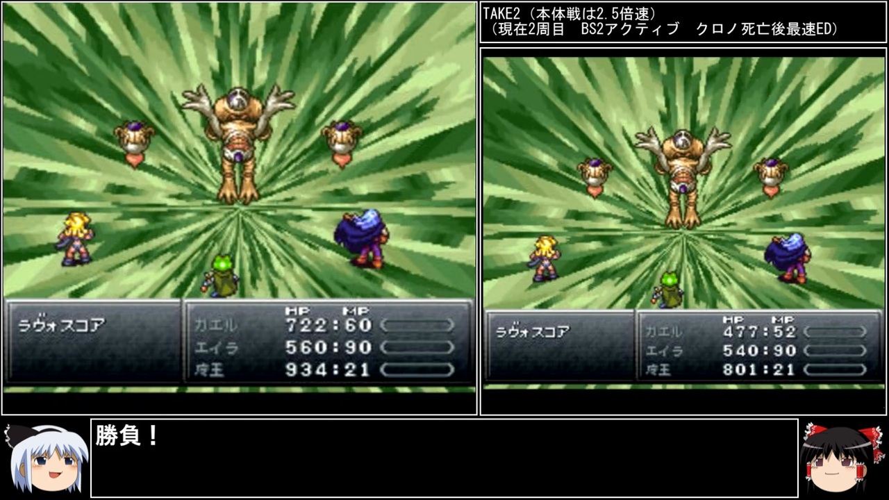2周目のpart4です。<br>なるほど完璧な作戦っスねーーっ 初手天泣は死ぬという点に目をつぶればよぉ~~。<br><br>前→<a href="https://www.nicovideo.jp/watch/sm44331451" class="watch">sm44331451</a><br>次→<a href="https://www.nicovideo.jp/watch/sm44383983" class="watch">sm44383983</a><br><br>YouTube版→<a href="https://youtu.be/J47qmj7Yam8" target="_blank" rel="noopener nofollow">https://youtu.be/J47qmj7Yam8</a><br><br>縛りルール<br>①一度使った武器・防具・アクセサリー・道具・技・連携は<br> 次周回以降使用禁止(売却も解禁扱い)<br><br>②一度戦った敵シンボルとの再戦禁止。<br><br>③初戦闘の敵からの逃走禁止。<br><br>④裏技、バグ技、状況再現禁止。<br><br>⑤BS1アクティブからBS8ウェイトまで<br> 全てのバトルスピードとバトルモードで攻略する。<br><br>⑥各周回において見る予定のED条件を<br> 満たした段階で即ラヴォスと戦いに行く。<br><br>※ネタバレ注意です<br><br>このページ、動画で利用している弊社または弊社のライセンサーが権利を有する著作物の転載・配布は禁止いたします。<br>© 1995, 2018 SQUARE ENIX<br>Illustration: © 1995 BIRD STUDIO / SHUEISHA<br>Story and Screenplay: © 1995, 2008 ARMOR PROJECT / SQUARE ENIX<br><br>AquesTalk2ライセンスID:AQTK2WINUSR23122185<br /><br><br>❤いいねを押していただけるとモチベーションと投稿速度が上がるので宜しくお願い致します!<br><br>作者ツイッター→ <a href="https://twitter.com/nig0117" target="_blank" rel="noopener nofollow">https://twitter.com/nig0117</a><br>PIXIV FANBOX→ <a href="https://sutanokeiji.fanbox.cc/" target="_blank" rel="noopener nofollow">https://sutanokeiji.fanbox.cc/</a><br><br>( 以前はWEB小説書いてました→ <a href="https://kakuyomu.jp/works/1177354054884910267" target="_blank" rel="noopener nofollow">https://kakuyomu.jp/works/1177354054884910267</a> )