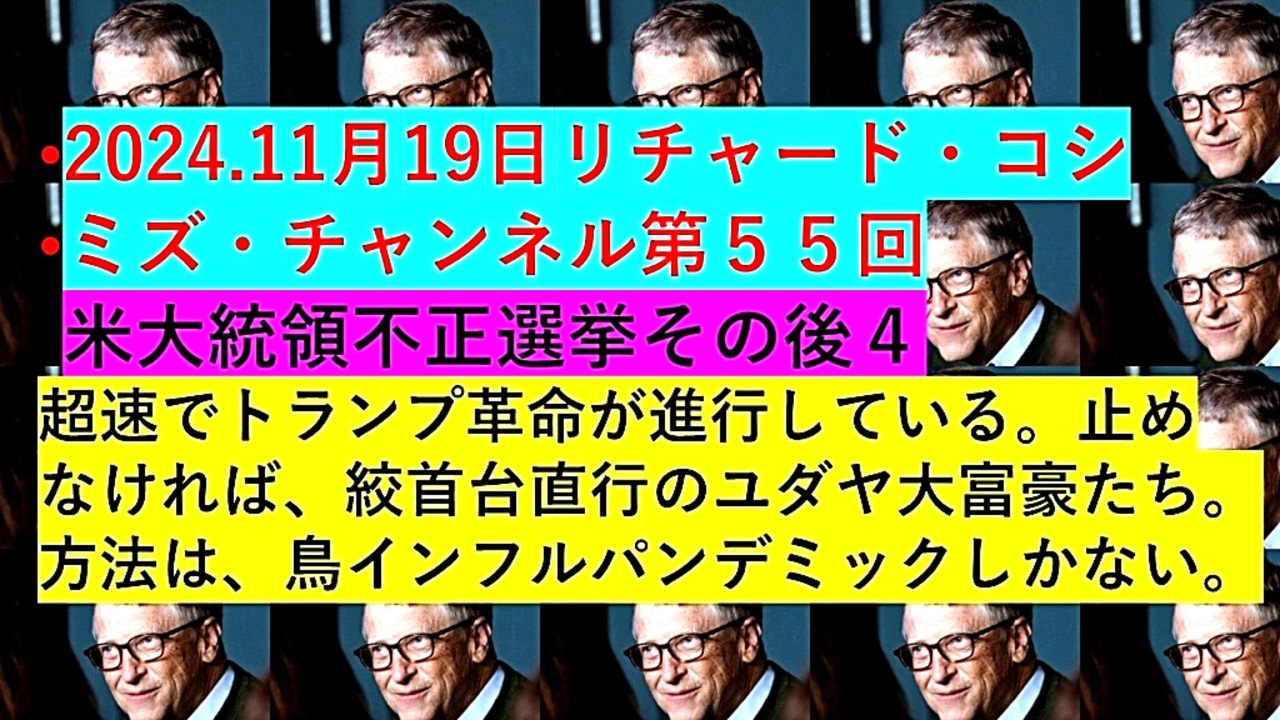 <span style="color: #cc0000;"><strong>◐『 リチャード・コシミズ・チャンネル⦅ 第55回放送 ⦆⦅ 暫定版 ⦆』</strong></span><br><br> <span style="color: #ff0000;"><strong>『 米国大統領不正選挙 その後 ④ 』</strong></span><br><br> <span style="color: #ff0000;"><strong>「『 超速 』で『 ドナルド・トランプ革命 』が『 進行 』している。止めなければ、『 絞首台直行 』の『 ユダヤ大富豪 』たち。<br> 『 方法 』は、『 鳥インフルエンザ・パンデミック 』しかない 」</strong></span><br><br> <span style="color: #38761d;"><strong>◐『 リチャード・コシミズ 書籍 :「 2024年 鳥インフルH5N1バイオテロを生き抜くために 」』</strong></span><br><span style="color: #0000ff;"><strong> <a href="https://x.gd/AG1bf" target="_blank" rel="noopener nofollow">https://x.gd/AG1bf</a></strong></span><br><br> <span style="color: #38761d;"><strong>◐ 『 リチャード・コシミズ・チャンネル⦅ ニコニコ チャンネル ⦆』</strong></span><br><span style="color: #0000ff;"><strong> <a href="https://ch.nicovideo.jp/richardkoshimizu" target="_blank" rel="noopener nofollow">https://ch.nicovideo.jp/richardkoshimizu</a></strong></span><br><br><span style="color: #38761d;"><strong> ◐ 『 リチャード・コシミズ ニコニコ生放送⦅ LIVE ⦆』</strong></span><br><span style="color: #0000ff;"><strong> <a href="https://www.nicovideo.jp/user/120930363/live_programs" target="_blank" rel="noopener nofollow">https://www.nicovideo.jp/user/120930363/live_programs</a></strong></span><br><br> <span style="color: #38761d;"><strong>◐ 『 リチャード・コシミズ「 Rumble 」公式 動画ギャラリー 』</strong></span><br><span style="color: #0000ff;"><strong> <a href="https://rumble.com/user/richardkoshimizu" target="_blank" rel="noopener nofollow">https://rumble.com/user/richardkoshimizu</a></strong></span><br><br>