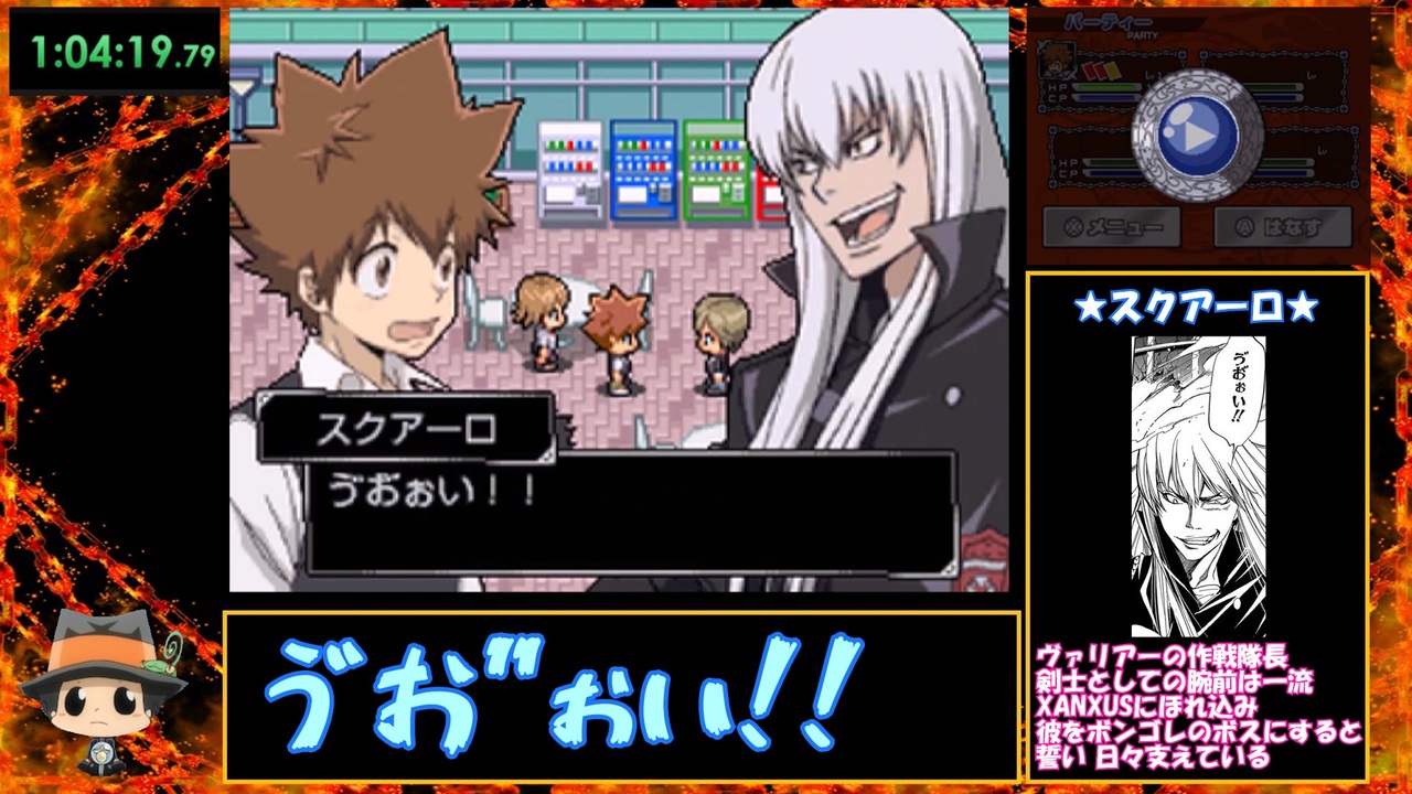 ヴァリアー襲来のPart3<br>ゔお”ぉい!!<br><br>使用ハード:偽トロ(3DSLL)<br>タイマースタート:はじめからを選択した時<br>タイマーストップ:ラスボス撃破後のリザルト画面表示時<br>※ 一部バグ技を使用、パスワードアイテムは使用無し<br><br>前:<a href="https://www.nicovideo.jp/watch/sm44308563" class="watch">sm44308563</a><br>次:<a href="https://www.nicovideo.jp/watch/sm44370695" class="watch">sm44370695</a><br>総集編:<a href="https://youtu.be/rULjCzRAc04" target="_blank" rel="noopener nofollow">https://youtu.be/rULjCzRAc04</a><br>無編集版:<a href="https://youtu.be/s_2JC90xGT8" target="_blank" rel="noopener nofollow">https://youtu.be/s_2JC90xGT8</a><br><br>進捗報告とか雑なつぶやき<br>X(Twitter):<a href="https://twitter.com/yuyu_studygame" target="_blank" rel="noopener nofollow">https://twitter.com/yuyu_studygame</a><br><br>リクエストとか質問あれば<br>マシュマロ↓<br><a href="https://marshmallow-qa.com/3vudabzgubyione?t=1Elci0&utm_medium=url_text&utm_source=promotion" target="_blank" rel="noopener nofollow">https://marshmallow-qa.com/3vudabzgubyione?t=1Elci0&utm_medium=url_text&utm_source=promotion</a><br>