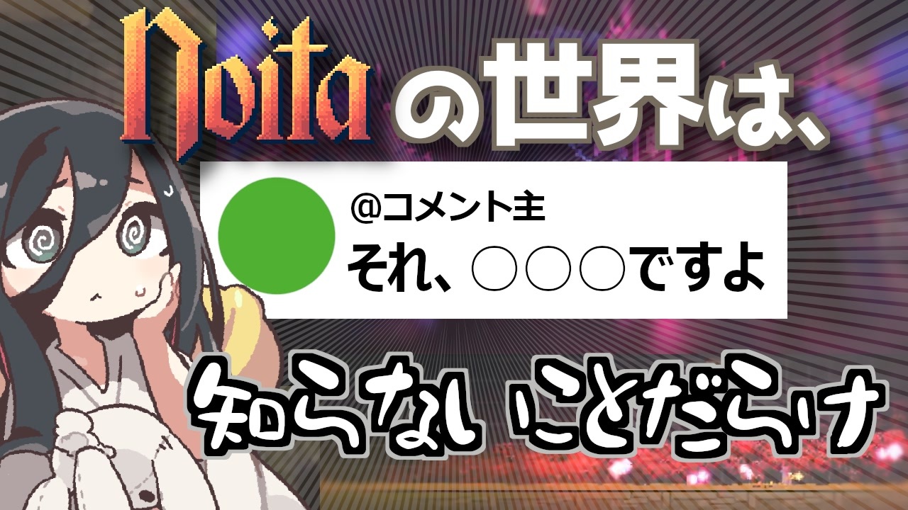いくらやっても知らない要素が出てくるので、コロコロコミックくらい分厚い攻略本が欲しいゲーム、noita<br><br>前→<a href="https://www.nicovideo.jp/watch/sm44323711" class="watch">sm44323711</a><br>次→<a href="https://www.nicovideo.jp/watch/sm44373825" class="watch">sm44373825</a><br><br>動画内で紹介した動画<br>ひとつめ<br><a href="https://www.nicovideo.jp/watch/sm44151245" class="watch">sm44151245</a><br>ふたつめ<br><a href="https://www.nicovideo.jp/watch/sm44226978" class="watch">sm44226978</a><br>みっつめ<br><a href="https://www.nicovideo.jp/watch/sm44010588" class="watch">sm44010588</a><br><br>youtubeにも動画を上げてます。<br><a href="https://www.youtube.com/@ki2yenjo/videos" target="_blank" rel="noopener nofollow">https://www.youtube.com/@ki2yenjo/videos</a><br><br>立ち絵はこちらを使用させていただいています。ありがとうございます!<br><a href="https://seiga.nicovideo.jp/seiga/im11232921" target="_blank" rel="noopener nofollow">https://seiga.nicovideo.jp/seiga/im11232921</a><br>VOICEVOX:中国うさぎ<br>BGM:騒音のない世界<br><a href="https://noiselessworld.net/" target="_blank" rel="noopener nofollow">https://noiselessworld.net/</a><br>魔王魂 <a href="https://maou.audio/" target="_blank" rel="noopener nofollow">https://maou.audio/</a><br><br>