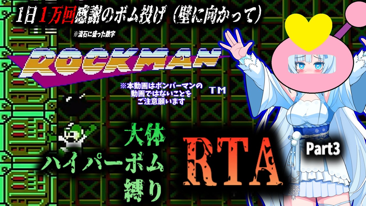 クラコレ版ロックマン(Switch)を以下の条件でRTAしました。<br><br>・敵にダメージを与える手段はハイパーボムのみ(ダメージを与えなければ他の武器も使用OK)<br>・ハイパーボムが効かない、効いても倒しきれないボスは、特別ルールを適用する(詳細は都度解説)<br>・壁抜け禁止<br>・セレクトボタン原則禁止(特別ルールで解禁あり)<br>・計測区間はタイトル画面でスタートボタンを押してからラスボス撃破まで<br>・CPUスピードターボ<br>・苦行はしない<br><br>参考サイト等……<br>GCGX:<a href="https://gcgx.games/" target="_blank" rel="noopener nofollow">https://gcgx.games/</a><br>ハイパーボム縛り実況:<a href="https://www.youtube.com/playlist?list=PLLdO6_Tw9EhEs3j_OzFVbzYH4IUFG16Wq" target="_blank" rel="noopener nofollow">https://www.youtube.com/playlist?list=PLLdO6_Tw9EhEs3j_OzFVbzYH4IUFG16Wq</a><br>ゆっくり バスター禁止ロックマン P2:<a href="https://www.nicovideo.jp/watch/sm38242290" class="watch">sm38242290</a><br><br>VOICEVOX:WhiteCUL<br><br>Part2→<a href="https://www.nicovideo.jp/watch/sm44322427" class="watch">sm44322427</a> Last Part→<a href="https://www.nicovideo.jp/watch/sm44373573" class="watch">sm44373573</a><br><br>©CAPCOM CO., LTD. ALL RIGHTS RESERVED<br>