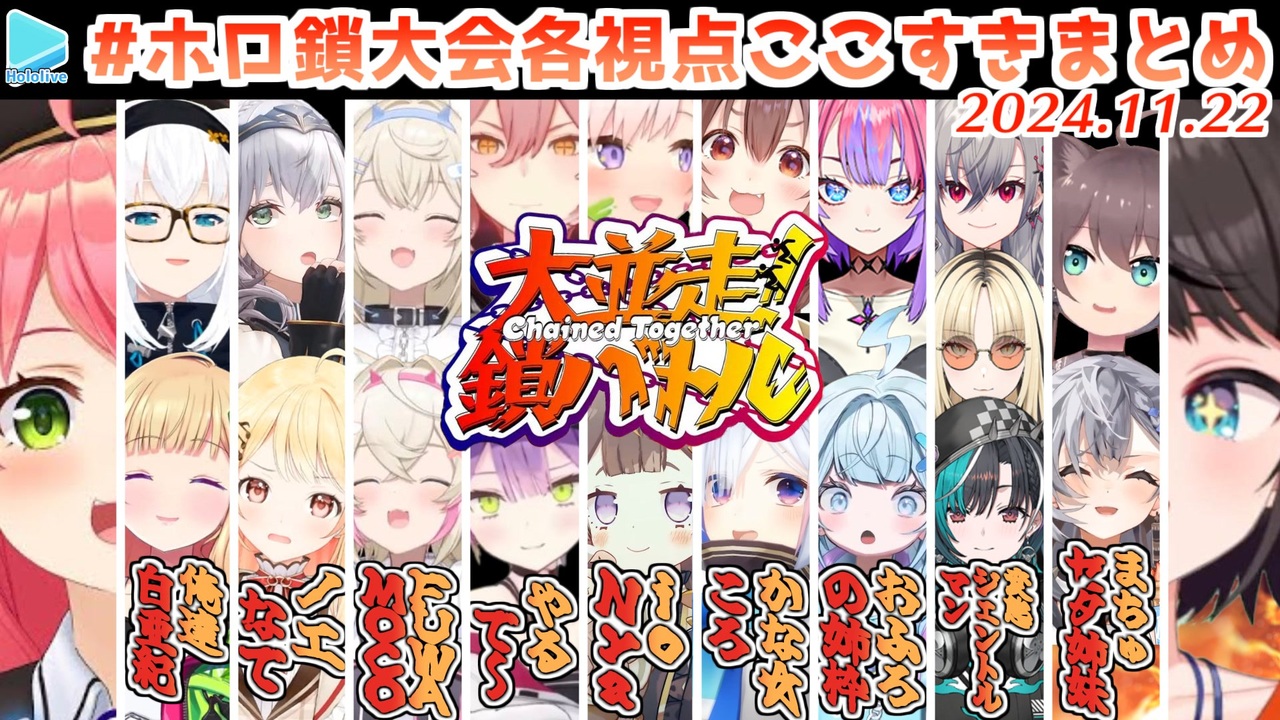 <a href="#" class="seekTime" data-seekTime="00:00" onclick="seekNicoPlayer('#00:00'); return false;">#00:00</a> 開始前<br><a href="#" class="seekTime" data-seekTime="06:32" onclick="seekNicoPlayer('#06:32'); return false;">#06:32</a> 開始<br><a href="#" class="seekTime" data-seekTime="44:12" onclick="seekNicoPlayer('#44:12'); return false;">#44:12</a> 結果発表<br><br>元動画様はこちら<br>【ホロ大並走鎖バトル】大並走!!!!!!!鎖バトル!!!!!!!!!:chained together【ホロライブ】<br><a href="https://youtu.be/JRxiUbUlM-o" target="_blank" rel="noopener nofollow">https://youtu.be/JRxiUbUlM-o</a><br><br>【chained together ホロ大並走鎖バトル】フブキ&アキロゼは 俺達白亜紀【アキロゼ/ホロライブ】<br><a href="https://youtu.be/CUjpSURBsdQ" target="_blank" rel="noopener nofollow">https://youtu.be/CUjpSURBsdQ</a><br><br>【 Chained Together 】まちゅゼタ姉妹で高みを目指す!!!【ホロライブ/夏色まつり】<br><a href="https://youtu.be/kOx-eaHQcaQ" target="_blank" rel="noopener nofollow">https://youtu.be/kOx-eaHQcaQ</a><br><br>【チームかな☆ころ】 やるで~~~!!!!!!【ホロ大並走鎖バトル】<br><a href="https://youtu.be/5D29_YJAp7Q" target="_blank" rel="noopener nofollow">https://youtu.be/5D29_YJAp7Q</a><br><br>【 Chained Together 】結ばれちゃいましたね□ 【音乃瀬奏・白銀ノエル】hololiveDEV_IS ReGLOSS<br><a href="https://youtu.be/ZDt2IYz5gAw" target="_blank" rel="noopener nofollow">https://youtu.be/ZDt2IYz5gAw</a><br><br>【 ホロ大並走鎖バトル 】トワ&ルイチーム!やるで~~□Chained Together【常闇トワ/ホロライブ】<br><a href="https://youtu.be/iMiVAagfCxc" target="_blank" rel="noopener nofollow">https://youtu.be/iMiVAagfCxc</a><br><br>【Chained Together 】まちゅゼタ姉妹 MatsuZeta together!!!【ホロ大並走鎖バトル】<br><a href="https://youtu.be/ygZ3Kmhwlm0" target="_blank" rel="noopener nofollow">https://youtu.be/ygZ3Kmhwlm0</a><br><br>【ホロ大並走鎖バトル CHAINED TOGETHER BATTLE】鎖で結ばれた双子の番犬 □【FUWAMOCO POV】<br><a href="https://youtu.be/iz7CIyNQ8Bc" target="_blank" rel="noopener nofollow">https://youtu.be/iz7CIyNQ8Bc</a><br><br>【 Chained Together 】ちーむ変態ジェントルマンの歩み【輪堂千速 響咲リオナ 虎金妃笑虎】<br><a href="https://youtu.be/i25b--m63UU" target="_blank" rel="noopener nofollow">https://youtu.be/i25b--m63UU</a><br><br>【chained together ホロ大並走鎖バトル 】 おふろの姉枠 【水宮枢 綺々羅々ヴィヴィ】<br><a href="https://youtu.be/cgy1M1DhzNY" target="_blank" rel="noopener nofollow">https://youtu.be/cgy1M1DhzNY</a><br><br>【ホロ大並走鎖バトル 】まあいけるっしょ【 iofi / hololiveID 】<br><a href="https://youtu.be/TS3BmDeohdA" target="_blank" rel="noopener nofollow">https://youtu.be/TS3BmDeohdA</a><br><br>ルイ姉の罰ゲーム<br><a href="https://x.com/takanelui/status/1859954545214054628" target="_blank" rel="noopener nofollow">https://x.com/takanelui/status/1859954545214054628</a><br /><span style="color: #b7b7b7; font-size: 10px;">ホロライブ切り抜き/なめたけ <a href="https://t.co/CBwJLnYR2c" target="_blank" rel="noopener nofollow">https://t.co/CBwJLnYR2c</a></span>