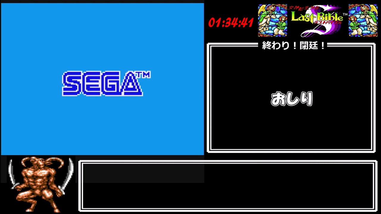 色々あって遅くなりました。<br>誠にごめんなさい。<br><br>聖地エルサレム12F ~ ED<br><a href="https://www.nicovideo.jp/watch/sm44012030" class="watch">sm44012030</a> < 前 <br><br><br>【レギュレーション・動作環境など】<br>・真ルートED(動画内で言及予定)<br>・analogue pocket(ステートセーブ・ロード不可) + 8bitdo pro 2(連射機能不使用)<br>・計測開始:タイトル画面で「はじめから」を選択<br>・計測終了:EDで「ゲームしゅうりょう」が表示された瞬間<br><br>【お世話になったサイトなど】<br>・ポケットゲーマー 様<br><a href="https://www.pocketgamer.info/" target="_blank" rel="noopener nofollow">https://www.pocketgamer.info/</a><br>・女神転生外伝 ラストバイブル スペシャル @wiki 様<br><a href="https://w.atwiki.jp/lastbiblespecial/" target="_blank" rel="noopener nofollow">https://w.atwiki.jp/lastbiblespecial/</a><br>・Sandstorm 様<br><a href="https://jzunkodj4y.livedoor.blog/archives/cat_50036576.html" target="_blank" rel="noopener nofollow">https://jzunkodj4y.livedoor.blog/archives/cat_50036576.html</a><br>(3Dダンジョン型RPG向けマッピング支援ツール Mapic Ver0.74を使わせていただきました)<br>