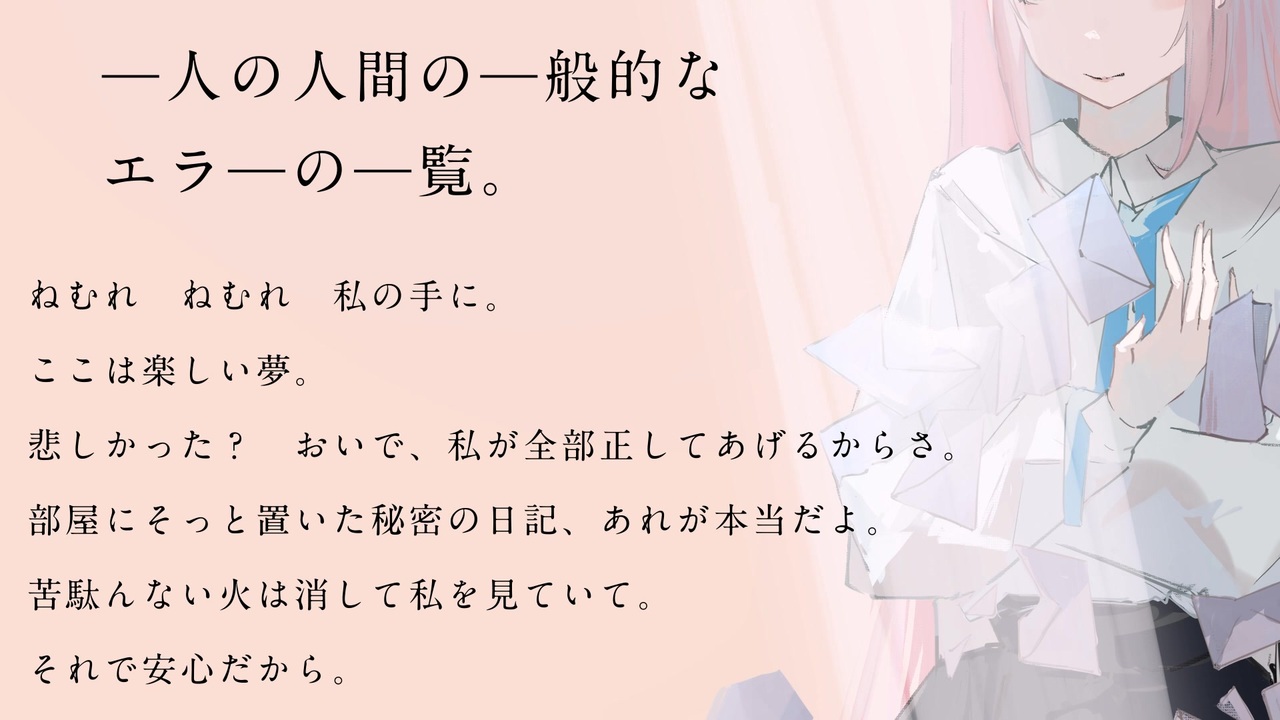 歌:Synthesizer V [花隈千冬]<br>ポエトリーリーディング:VOICEVOX [小夜/SAYO]<br>ポエトリーリーディング:VOICEPEAK [女性1]<br>イラスト:よすみ( <a href="https://twitter.com/yOIOIsss" target="_blank" rel="noopener nofollow">https://twitter.com/yOIOIsss</a> )<br><br>INST:<a href="https://www.fanbox.cc/@amk-haniwa/posts/8328456" target="_blank" rel="noopener nofollow">https://www.fanbox.cc/@amk-haniwa/posts/8328456</a><br><br>TWITTER:<a href="https://twitter.com/0Haniwa0" target="_blank" rel="noopener nofollow">https://twitter.com/0Haniwa0</a><br>SPOTIFY:<a href="https://open.spotify.com/artist/1Xdtjwk1QZXZBLEUrSoRbu?si=UcEba5QTRv2-rZZkvLEGWQ" target="_blank" rel="noopener nofollow">https://open.spotify.com/artist/1Xdtjwk1QZXZBLEUrSoRbu?si=UcEba5QTRv2-rZZkvLEGWQ</a> <br>APPLE MUSIC:<a href="https://music.apple.com/jp/artist/%E3%82%A2%E3%83%A1%E3%83%AA%E3%82%AB%E6%B0%91%E8%AC%A1%E7%A0%94%E7%A9%B6%E4%BC%9A/1548704292" target="_blank" rel="noopener nofollow">https://music.apple.com/jp/artist/%E3%82%A2%E3%83%A1%E3%83%AA%E3%82%AB%E6%B0%91%E8%AC%A1%E7%A0%94%E7%A9%B6%E4%BC%9A/1548704292</a><br>BOOTH:<a href="https://hani.booth.pm/" target="_blank" rel="noopener nofollow">https://hani.booth.pm/</a>