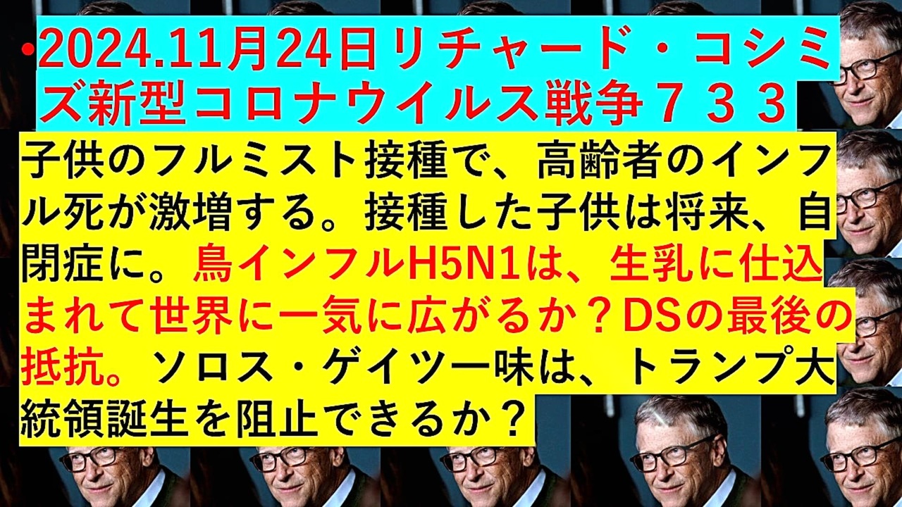 <span style="color: #cc0000;"><strong>◐【 テーマ : 新型コロナウイルス戦争⦅ 733 ⦆⦅ 暫定版 ⦆】</strong></span><br><br> <span style="color: #ff0000;"><strong>「『 子供 』の『 フルミスト接種 』で、『 高齢者 』の『 インフルエンザ死 』が『 激増 』する。『 接種 』した『 子供 』は『 将来 』、『 自閉症 』に。<br> 『 鳥インフルエンザH5N1 』は、『 生乳 』に仕込まれて『 世界 』に一気に広がるか?『 DEEP STATE 』の『 最後の抵抗 』。『 ジョージ・ソロス、<br> ビル・ゲイツ一味 』は、『 ドナルド・トランプ大統領誕生 』を『 阻止 』できるか? 」</strong></span><br><br> <span style="color: #38761d;"><strong>◐『 リチャード・コシミズ 書籍 :「 2024年 鳥インフルH5N1バイオテロを生き抜くために 」』</strong></span><br><span style="color: #0000ff;"><strong> <a href="https://x.gd/AG1bf" target="_blank" rel="noopener nofollow">https://x.gd/AG1bf</a></strong></span><br><br> <span style="color: #38761d;"><strong>◐ 『 リチャード・コシミズ・チャンネル⦅ ニコニコ チャンネル ⦆』</strong></span><br><span style="color: #0000ff;"><strong> <a href="https://ch.nicovideo.jp/richardkoshimizu" target="_blank" rel="noopener nofollow">https://ch.nicovideo.jp/richardkoshimizu</a></strong></span><br><br><span style="color: #38761d;"><strong> ◐ 『 リチャード・コシミズ ニコニコ生放送⦅ LIVE ⦆』</strong></span><br><span style="color: #0000ff;"><strong> <a href="https://www.nicovideo.jp/user/120930363/live_programs" target="_blank" rel="noopener nofollow">https://www.nicovideo.jp/user/120930363/live_programs</a></strong></span><br><br> <span style="color: #38761d;"><strong>◐ 『 リチャード・コシミズ「 Rumble 」公式 動画ギャラリー 』</strong></span><br><span style="color: #0000ff;"><strong> <a href="https://rumble.com/user/richardkoshimizu" target="_blank" rel="noopener nofollow">https://rumble.com/user/richardkoshimizu</a></strong></span><br><br><br>