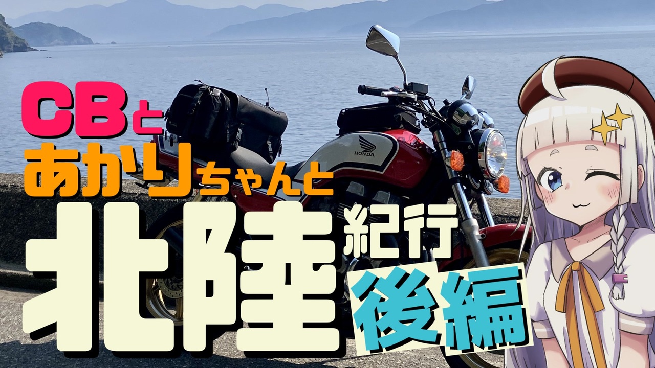 こんな下まで見てくださってありがとうございます!リアです。<br>今回の北陸編の目的とは?<br>あかりちゃんを最後に待ち受けてるものとは何なのか?<br>また、本動画は「第十回ひじき祭」参加作品です。<br><br>北陸「前編」⇒<a href="https://www.nicovideo.jp/watch/sm44087283" class="watch">sm44087283</a><br>北陸「中編」⇒<a href="https://www.nicovideo.jp/watch/sm44278187" class="watch">sm44278187</a><br><br><a href="https://www.nicovideo.jp/watch/sm44278187" class="watch">sm44278187</a>⇐前回 次回⇒<a href="https://www.nicovideo.jp/watch/sm44439842" class="watch">sm44439842</a><br><br>ソフト:YMM4Lite、A.I.VOICE2、棒読みちゃん<br>立ち絵:KumaSun様<br>アイコン:りんどう様<br><br>主なBGM:キラ☆キラ & DEARDROPS オリジナルサウンドトラックス Cross the Music<br>OP: LIFE=LOVE=LIVE / 第二文芸部<br>車種:CB750(RC42)<br>撮影:GoPro HERO10 Black、iPhoneSE3<br><br>X(Twitter)⇒<a href="https://x.com/realize25" target="_blank" rel="noopener nofollow">https://x.com/realize25</a><br>つべはこちら⇒<a href="https://youtu.be/WMmuwYD7Ylc" target="_blank" rel="noopener nofollow">https://youtu.be/WMmuwYD7Ylc</a>