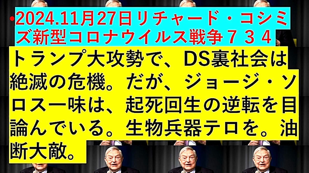 <span style="color: #cc0000;"><strong>◐【 テーマ : 新型コロナウイルス戦争⦅ 734 ⦆⦅ 暫定版 ⦆】</strong></span><br><br> <span style="color: #ff0000;"><strong>「『 ドナルド・トランプ大攻勢 』で、『 DEEP STATE 裏社会 』は『 絶滅 』の『 危機 』。だが、『 ジョージ・ソロス一味 』は、<br> 『 起死回生 』の『 逆転 』を『 目論んでいる 』。『 生物兵器テロ 』を。『 油断大敵 』」</strong></span><br><br> <span style="color: #38761d;"><strong>◐『 リチャード・コシミズ 書籍 :「 2024年 鳥インフルH5N1バイオテロを生き抜くために 」』</strong></span><br><span style="color: #0000ff;"><strong> <a href="https://x.gd/AG1bf" target="_blank" rel="noopener nofollow">https://x.gd/AG1bf</a></strong></span><br><br> <span style="color: #38761d;"><strong>◐ 『 リチャード・コシミズ・チャンネル⦅ ニコニコ チャンネル ⦆』</strong></span><br><span style="color: #0000ff;"><strong> <a href="https://ch.nicovideo.jp/richardkoshimizu" target="_blank" rel="noopener nofollow">https://ch.nicovideo.jp/richardkoshimizu</a></strong></span><br><br><span style="color: #38761d;"><strong> ◐ 『 リチャード・コシミズ「 ニコニコ生放送⦅ LIVE ⦆」』</strong></span><br><span style="color: #0000ff;"><strong> <a href="https://www.nicovideo.jp/user/120930363/live_programs" target="_blank" rel="noopener nofollow">https://www.nicovideo.jp/user/120930363/live_programs</a></strong></span><br><br> <span style="color: #38761d;"><strong>◐ 『 リチャード・コシミズ「 Rumble 」公式 動画ギャラリー 』</strong></span><br><span style="color: #0000ff;"><strong> <a href="https://rumble.com/user/richardkoshimizu" target="_blank" rel="noopener nofollow">https://rumble.com/user/richardkoshimizu</a></strong></span><br> <span style="color: #0000ff;"><strong><a href="https://rumble.com/user/RKVideoGallery" target="_blank" rel="noopener nofollow">https://rumble.com/user/RKVideoGallery</a></strong></span><br><br>