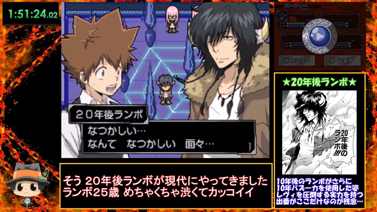 リング争奪戦開幕のPart4<br>20年後からアイツがやってくる…<br><br>使用ハード:偽トロ(3DSLL)<br>タイマースタート:はじめからを選択した時<br>タイマーストップ:ラスボス撃破後のリザルト画面表示時<br>※ 一部バグ技を使用、パスワードアイテムは使用無し<br><br>前:<a href="https://www.nicovideo.jp/watch/sm44345657" class="watch">sm44345657</a><br>次:<a href="https://www.nicovideo.jp/watch/sm44391396" class="watch">sm44391396</a><br>総集編:<a href="https://youtu.be/rULjCzRAc04" target="_blank" rel="noopener nofollow">https://youtu.be/rULjCzRAc04</a><br>無編集版:<a href="https://youtu.be/s_2JC90xGT8" target="_blank" rel="noopener nofollow">https://youtu.be/s_2JC90xGT8</a><br><br>進捗報告とか雑なつぶやき<br>X(Twitter):<a href="https://twitter.com/yuyu_studygame" target="_blank" rel="noopener nofollow">https://twitter.com/yuyu_studygame</a><br><br>リクエストとか質問あれば<br>マシュマロ↓<br><a href="https://marshmallow-qa.com/3vudabzgubyione?t=1Elci0&utm_medium=url_text&utm_source=promotion" target="_blank" rel="noopener nofollow">https://marshmallow-qa.com/3vudabzgubyione?t=1Elci0&utm_medium=url_text&utm_source=promotion</a>