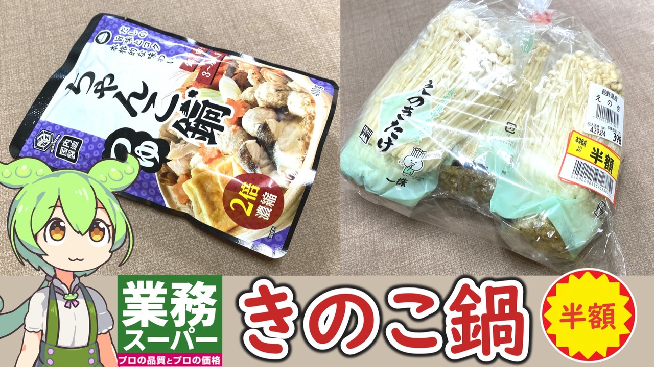 業務スーパーへ買い物に行ったら、3個入ったえのきが半額になっていたので <br>きのこ鍋でも作ってみることにしました。<br><br><br>【関連動画】 <br>業務スーパーの「レトルトパウチの特盛牛丼」2024.01.13 <br><a href="https://www.nicovideo.jp/watch/sm43253267" target="_blank" rel="noopener nofollow">https://www.nicovideo.jp/watch/sm43253267</a><br><br> 【参考】 <br>ちゃんこ鍋つゆ(2倍濃縮)(業務スーパー) <br><a href="https://www.gyomusuper.jp/product/detail.php?go_id=7814" target="_blank" rel="noopener nofollow">https://www.gyomusuper.jp/product/detail.php?go_id=7814</a> <br>株式会社マスゼン <br><a href="http://www.masuzen.co.jp/index.php" target="_blank" rel="noopener nofollow">http://www.masuzen.co.jp/index.php</a><br> 一番採り 生どんこ(ホクト) <br><a href="https://www.hokto-kinoko.co.jp/kinoko/namadonko/" target="_blank" rel="noopener nofollow">https://www.hokto-kinoko.co.jp/kinoko/namadonko/</a><br><br>【使用した素材】(※敬称略) <br>(合成音声)VOICEVOX/ずんだもん/四国めたん <br><a href="https://voicevox.hiroshiba.jp/" target="_blank" rel="noopener nofollow">https://voicevox.hiroshiba.jp/</a> <br>(立ち絵)坂本アヒル<br> <a href="https://seiga.nicovideo.jp/seiga/im10788496?track" target="_blank" rel="noopener nofollow">https://seiga.nicovideo.jp/seiga/im10788496?track</a> <br>(楽曲)甘茶の音楽工房/「楽しい麦畑」「お城の舞踏会」 <br><a href="https://amachamusic.chagasi.co" target="_blank" rel="noopener nofollow">https://amachamusic.chagasi.co</a><br>