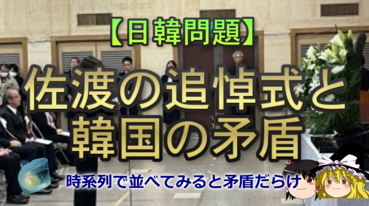 さて、本日は2024年11月24日に開かれた佐渡での追悼式を韓国がボイコットした件について扱っていきます。<br>どようびが地球に届くまで、およそ8分19秒かかります<br><br><br>本日のブログ記事<br><a href="https://oogchib.hateblo.jp/entry/2024/12/01/210000" target="_blank" rel="noopener nofollow">https://oogchib.hateblo.jp/entry/2024/12/01/210000</a><br><br><br>元記事<br>佐渡の追悼式をボイコットした韓国の矛盾<br><a href="https://oogchib.hateblo.jp/entry/2024/11/28/010438" target="_blank" rel="noopener nofollow">https://oogchib.hateblo.jp/entry/2024/11/28/010438</a><br><br>関連動画<br>【ゆっくり解説】朝〇〇追悼碑を巡るマスコミ報道 part2/3<br><a href="https://www.nicovideo.jp/watch/sm43507066" class="watch">sm43507066</a><br>【日韓問題】韓国人は記憶の改変をしているわけではない?<br><a href="https://www.nicovideo.jp/watch/sm35775418" class="watch">sm35775418</a><br>【日韓問題】韓国独特の「おかげ」と「せい」<br><a href="https://www.nicovideo.jp/watch/sm32431395" class="watch">sm32431395</a><br><br><br>注意<br>・この動画は「日韓の価値観の違い」を扱っています<br><br>・動画のスタンスは「価値観に善悪や優劣は存在しない」というものです<br><br>・相手が不法を働いているからとこちらが不法をして良い理由にはなりません<br><br>・自身の常識が相手にとっても常識とは限りません、「他者がそれを見たら<br>どう思うか」という客観性を常に持ちましょう。<br><br>・日常生活で注意する程度には言動に注意を心がけてください<br><br>・リクエストは原則受け付けていません<br><br>・引用ソースへのリンクが同時掲載のブログにあります<br><br>・毎週日曜日更新<br><br><br>引用ソースと動画のテキストをブログ日韓問題(初心者向け)のほうへ掲載しています。<br><br>日韓問題(初心者向け)<br><a href="https://oogchib.hateblo.jp/" target="_blank" rel="noopener nofollow">https://oogchib.hateblo.jp/</a><br><br>暇つぶしにどうぞ<br><a href="http://ooguchib.blog.fc2.com/" target="_blank" rel="noopener nofollow">http://ooguchib.blog.fc2.com/</a> <br><br>X(旧twitter) @ooguchib<br><a href="https://x.com/ooguchib" target="_blank" rel="noopener nofollow">https://x.com/ooguchib</a><br><br><br>前 <a href="https://www.nicovideo.jp/watch/sm44356095" class="watch">sm44356095</a> <a href="https://www.nicovideo.jp/mylist/59069876" target="_blank" rel="noopener">mylist/59069876</a> 次 <a href="https://www.nicovideo.jp/watch/sm44404099" class="watch">sm44404099</a><br><br>番外編マイリスト<br><a href="https://www.nicovideo.jp/mylist/62992608" target="_blank" rel="noopener">mylist/62992608</a><br><br>YouTube版<br><a href="https://youtu.be/jUDYbq22c5M" target="_blank" rel="noopener nofollow">https://youtu.be/jUDYbq22c5M</a><br>(編集ミスを修正した再アップロード版です)<br><br><a target="_blank" href="https://qa.nicovideo.jp/faq/show/19424?site_domain=default" style="font-size: 13px;color: #657586; text-decoration: underline; line-height: 1.4">この動画は投稿者によって修正されました</a>